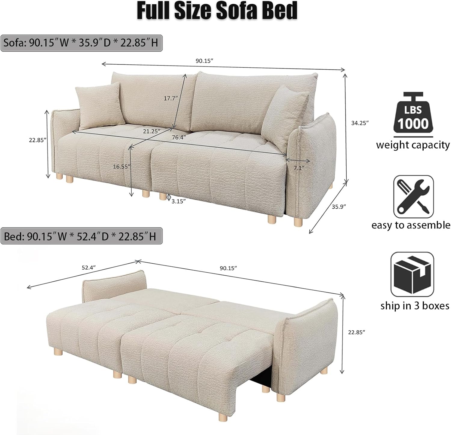- Dimensions (Inches): Sofa - 35.9"(D) x 90"(W) x 34.2"(H) ; Bed - 52.4"(D) x 90"(W) x 22.8"(H)