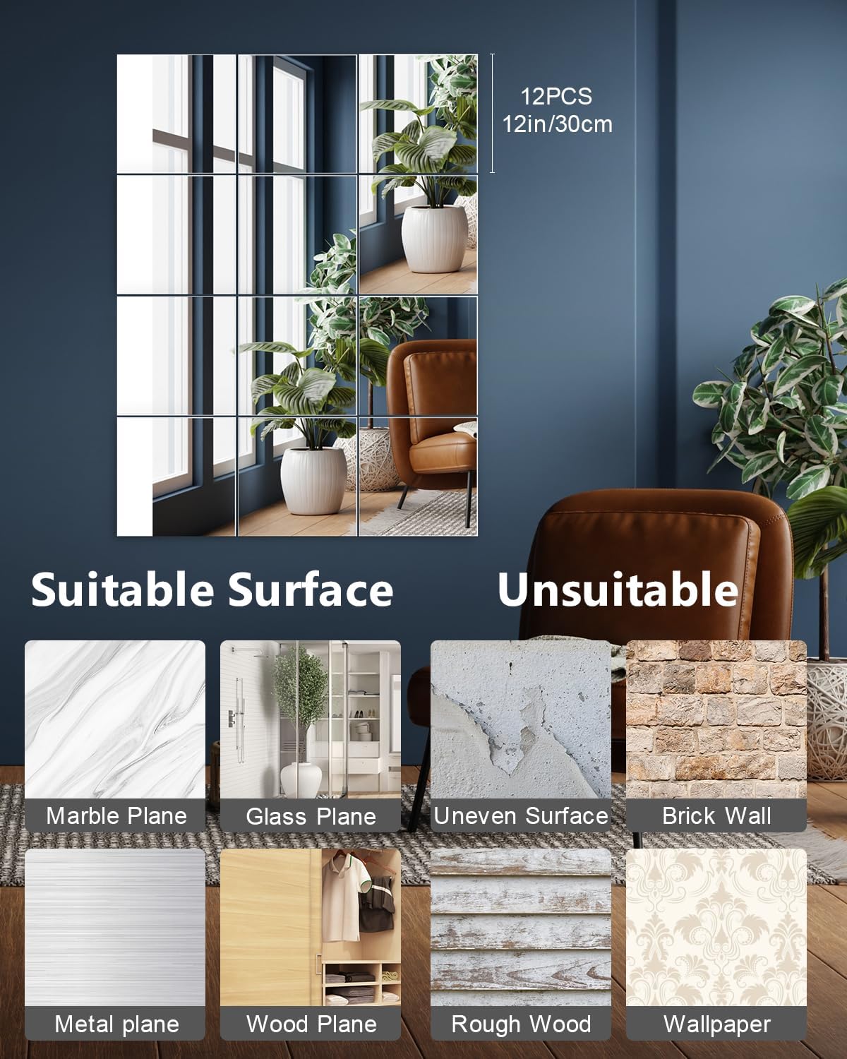 - Clear Imaging Within 0.5m:This 12'' x 12'' mirror set, featuring 12 pieces,The mirror offers clear images within a 0.5-meter range, making it a safe choice for wall decoration. Beyond this distance, image clarity diminishes.