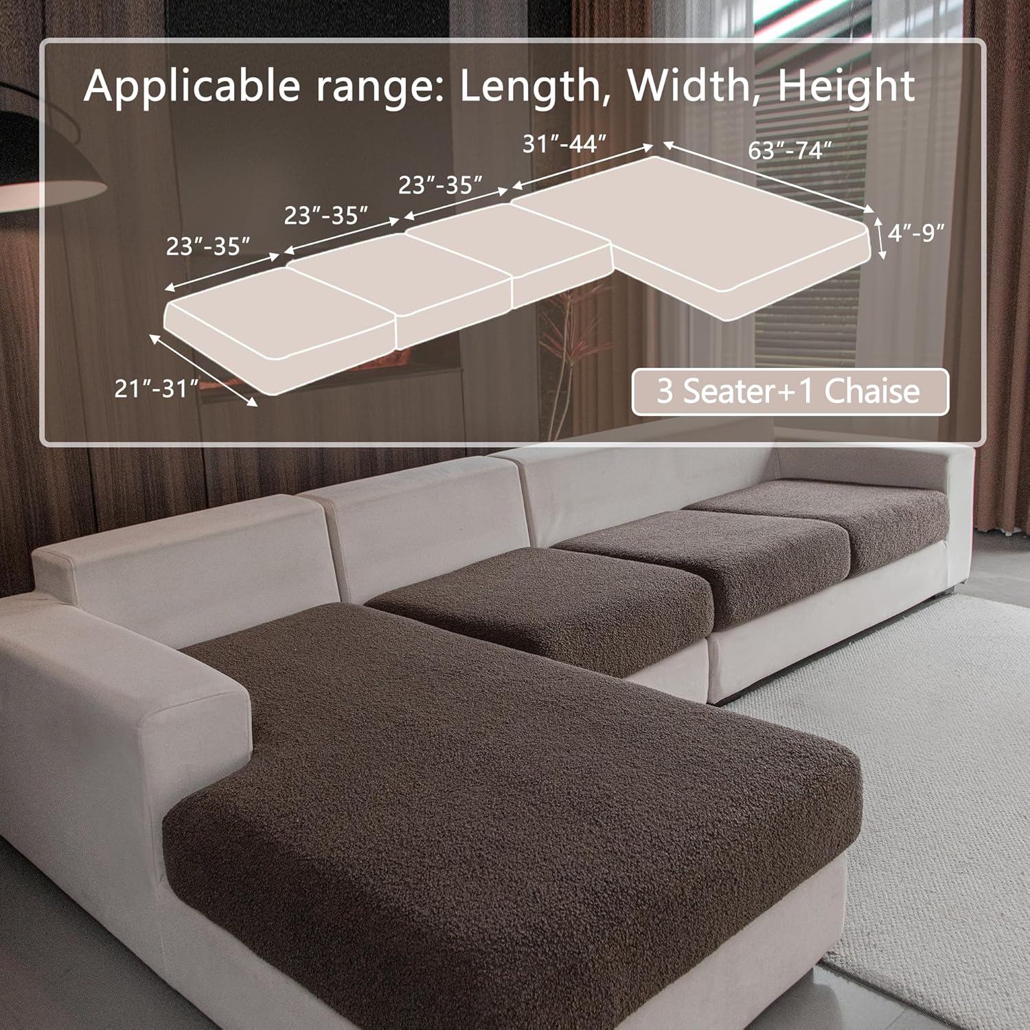 - 1.WHAT YOU WILL GET: 3*Seat Cushion Cover S + 1*Chaise Cushion Cover.Suitable for sofa seat cushions with Length: 23-35 inches, Width: 21-31 inches, Height: 4-9 inches, and chaise cushion with Length: 63-74 inches, Width: 31-44 inches, Height: 4-9 inches.This sectional couch cover is tailor-made for your sofa and can effectively resist stains, dust, pet hair and daily wear and tear.Made of soft Polar Fleece fabric, it adds a cozy and warm touch to your seat.