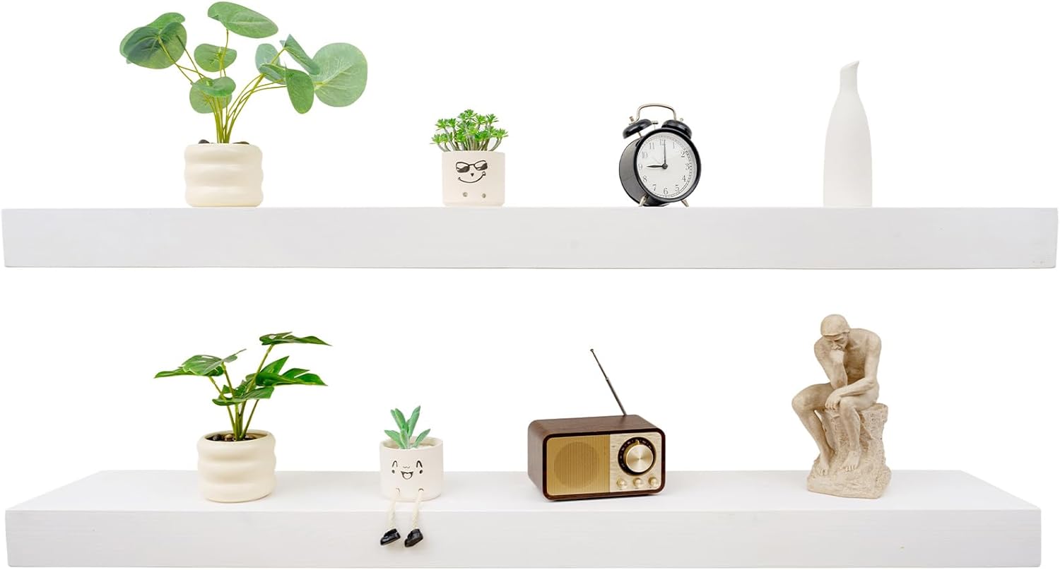 Floating Shelves 3 inch Thick for Wall Set of 2,Solid Pine Wood Wall Mount Shelf for Kitchen Living Room Bedroom Bathroom,8" D x 60" L x 3" H-White