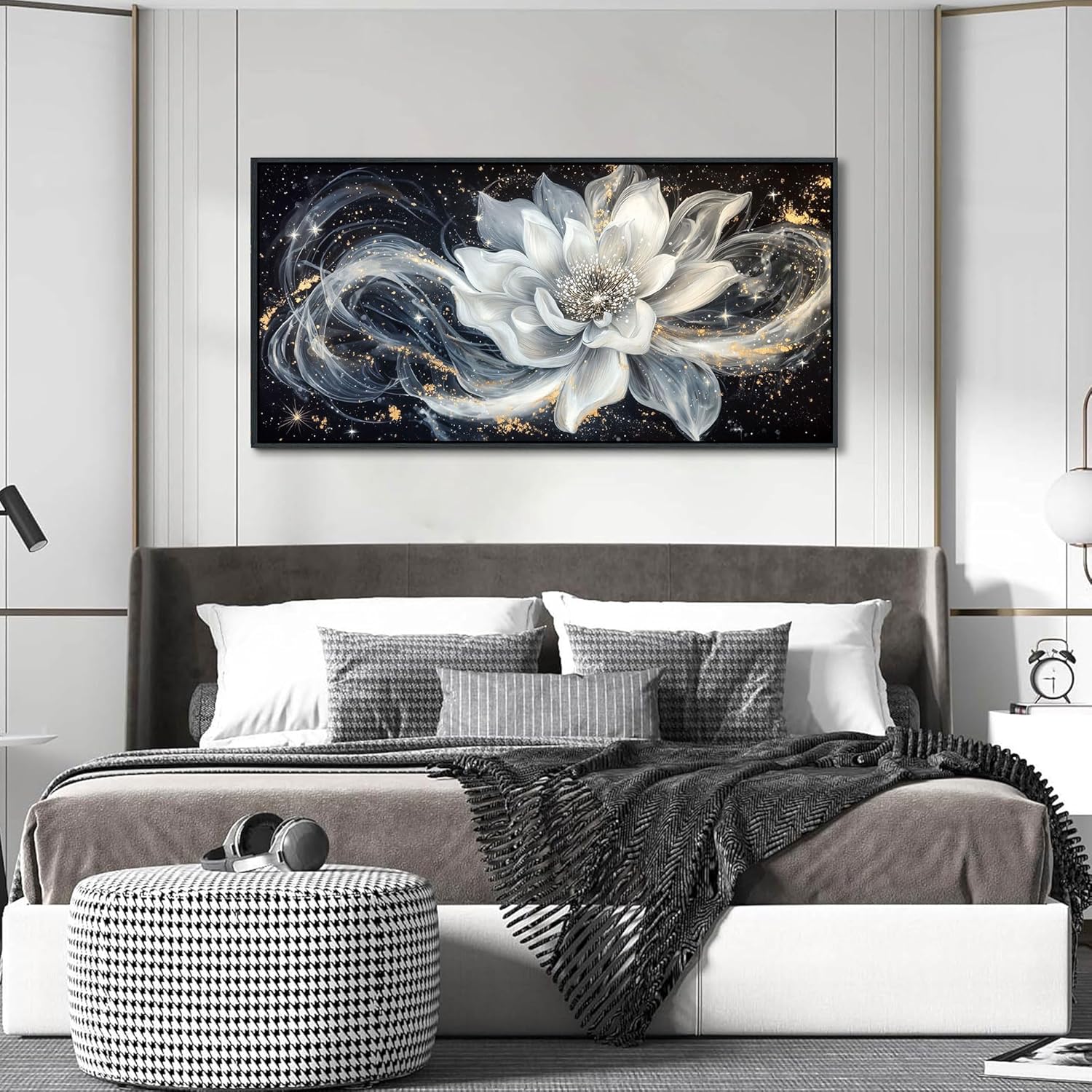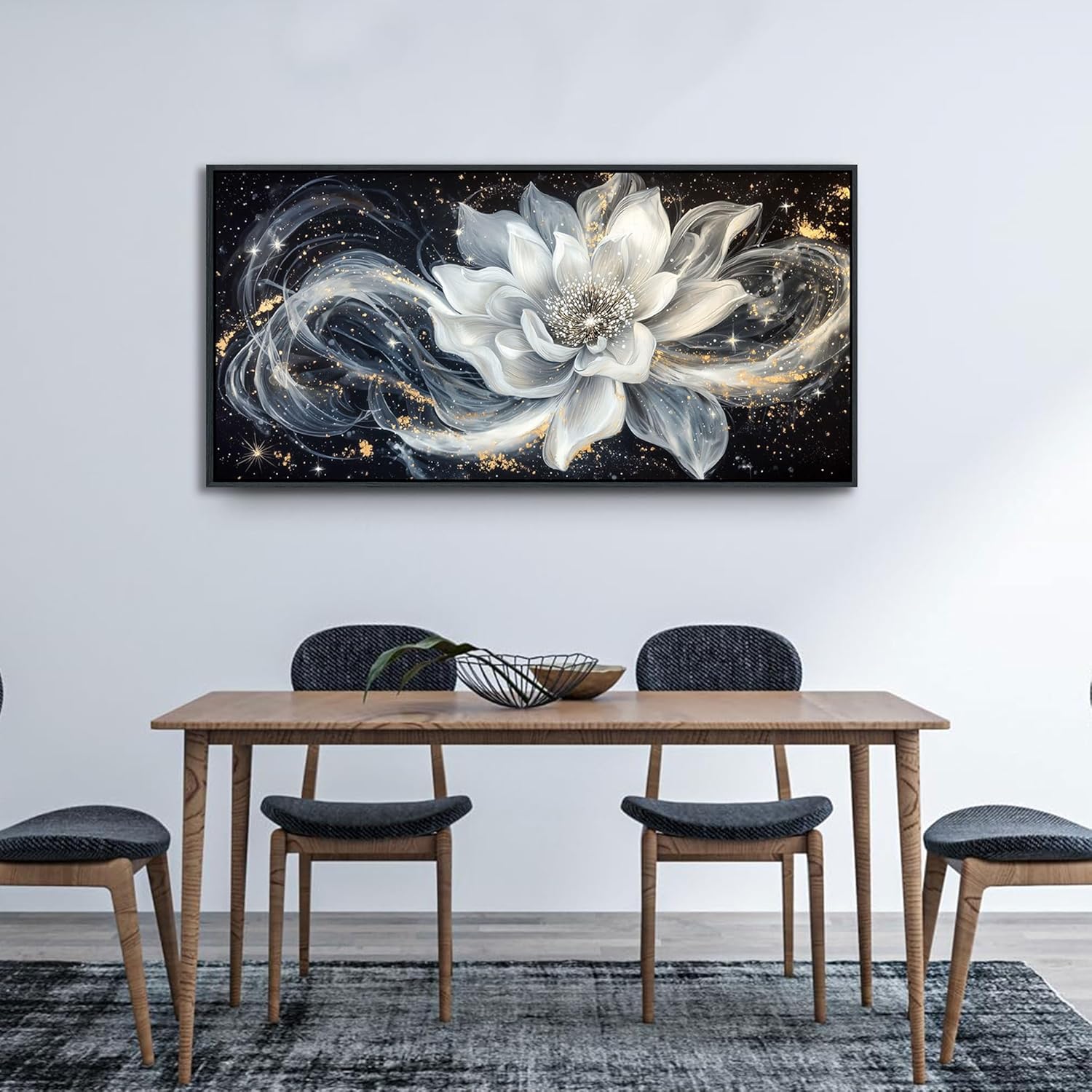 - Art Work for Wall Decor: This canvas wall art merges a blooming white flower with a celestial backdrop, blending flower wall art and cosmic elegance. The soft petals contrast with golden starlight, creating a dreamy scene perfect as large wall art for living room or wall art bedroom decor. Its black and white wall art palette with gold accents adds sophistication, standing out among pictures for living room or modern wall art collections.