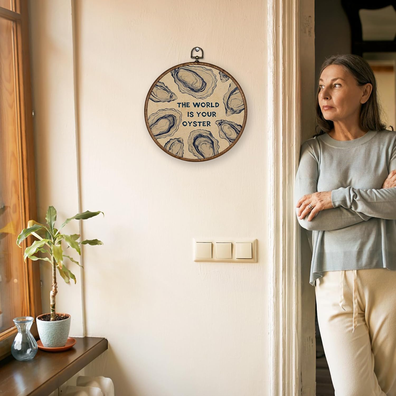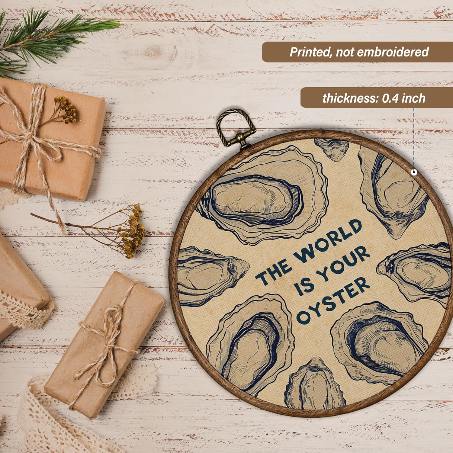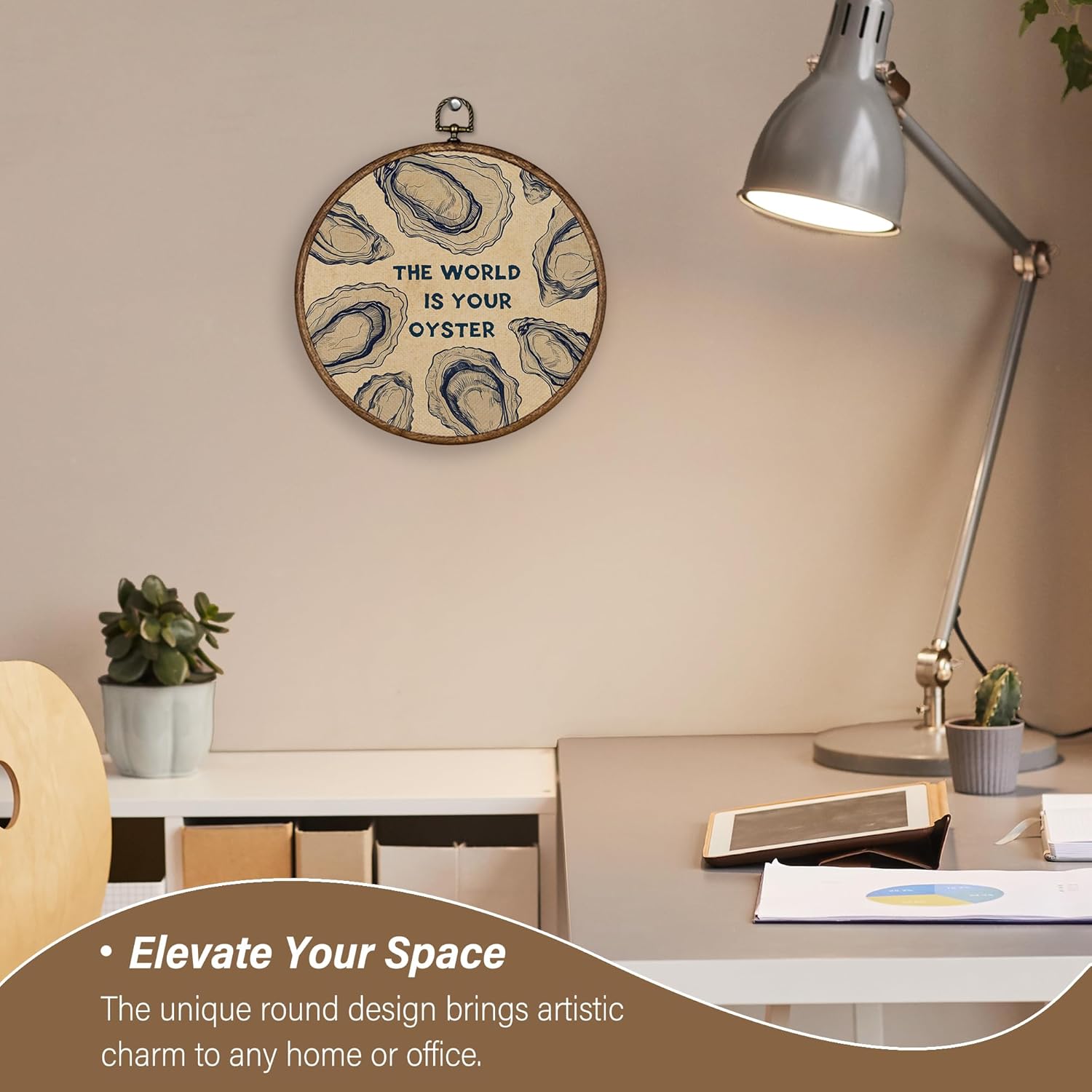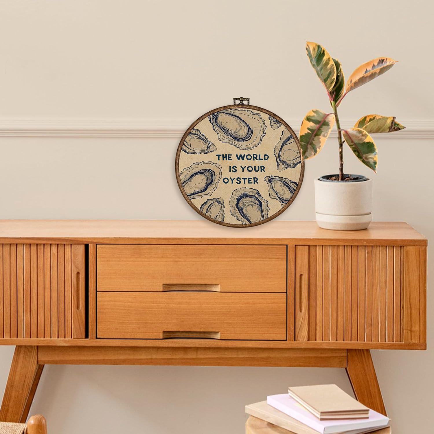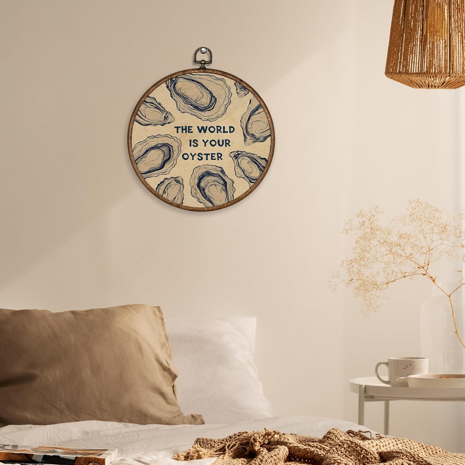 XBBMGG Oyster Wall Art Decor, Coastal Vintage Oyster Shell Round Wall Hanging Decor, Beach Ocean Nautical The World Is Your Oyster Framed Canvas Prints for Living Room Bathroom Decorations, 10x10inch