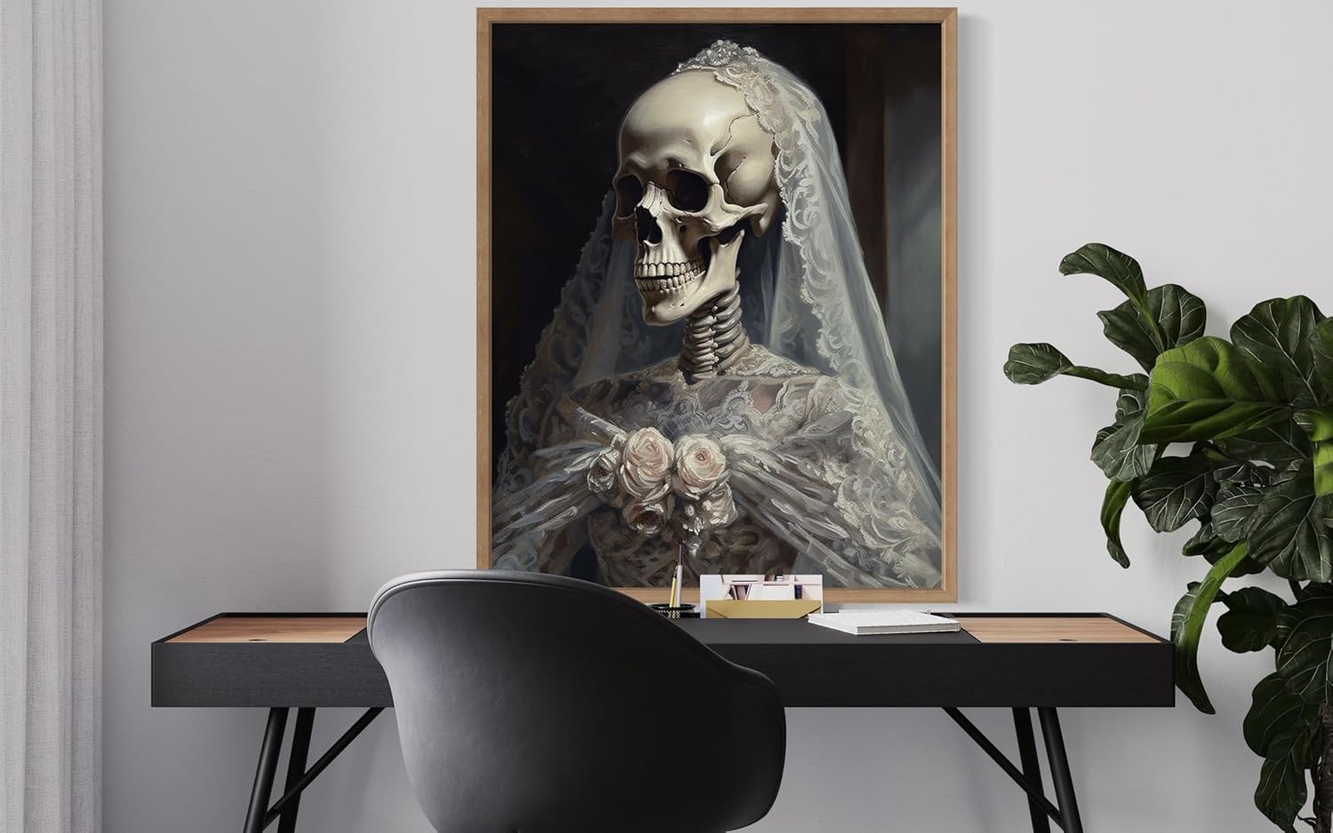 Skull Gown Poster Art Print, Halloween Scary Vintage Wall Art Academia Spooky Painting Decoration for Horror Prints, Gothic Posters Bedroom Decor 89 (Skull Gown, 8 x 10 inches, Wood Frame)