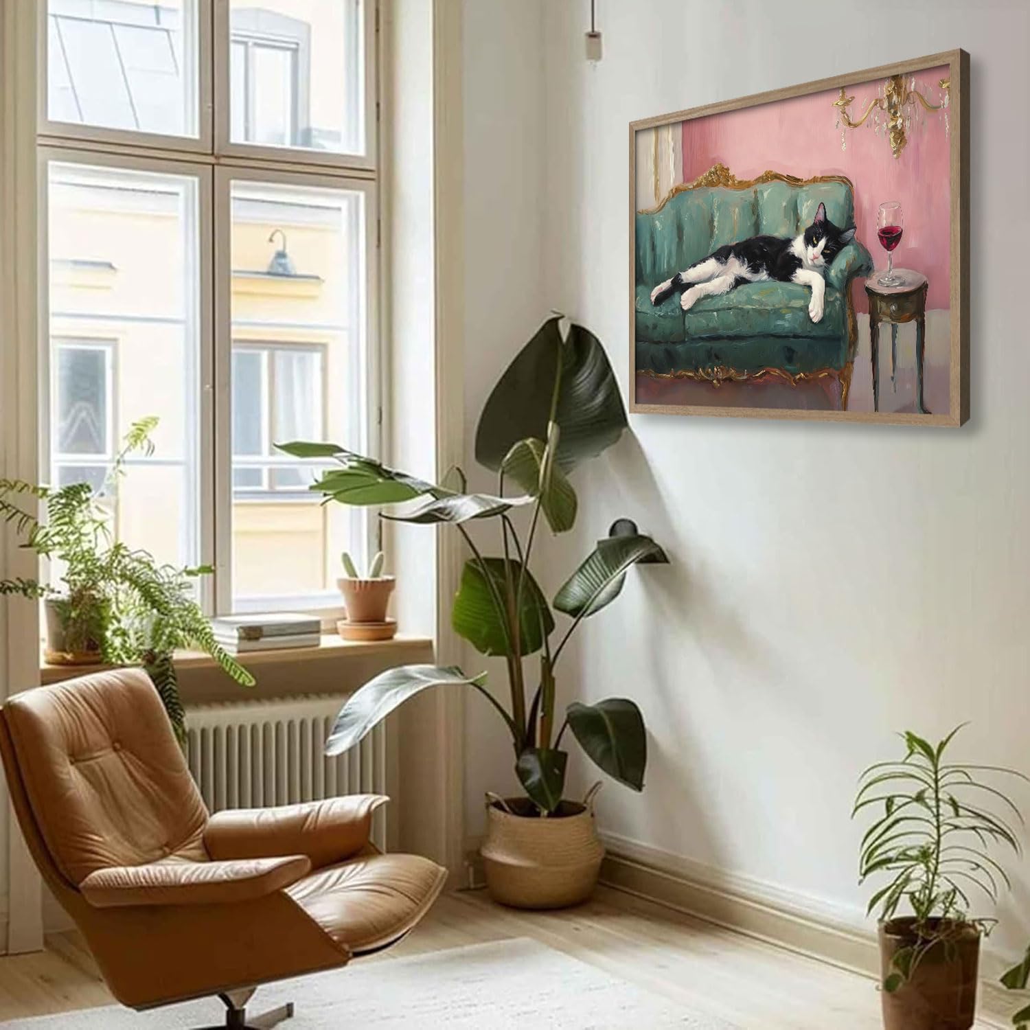 - Casual Style Black Cat Art: This painting shows a black cat lazily lying on a green sofa, with a warm pink background, giving any space a relaxing and pleasant atmosphere, perfect for modern homes.