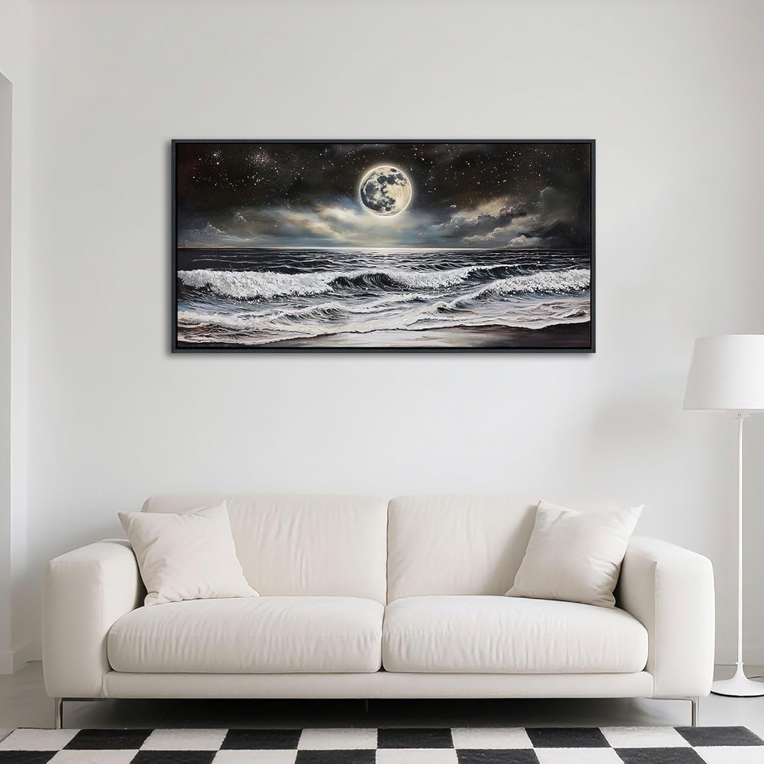 QZQCBLC Black and White Wall Art, Sea Beach Pictures Moon Starry Clouds Ocean Scene Framed Canvas Paintings Artwork for Living room Bathroom Bedroom Home Office Wall Pictures Decor 20x40 IN