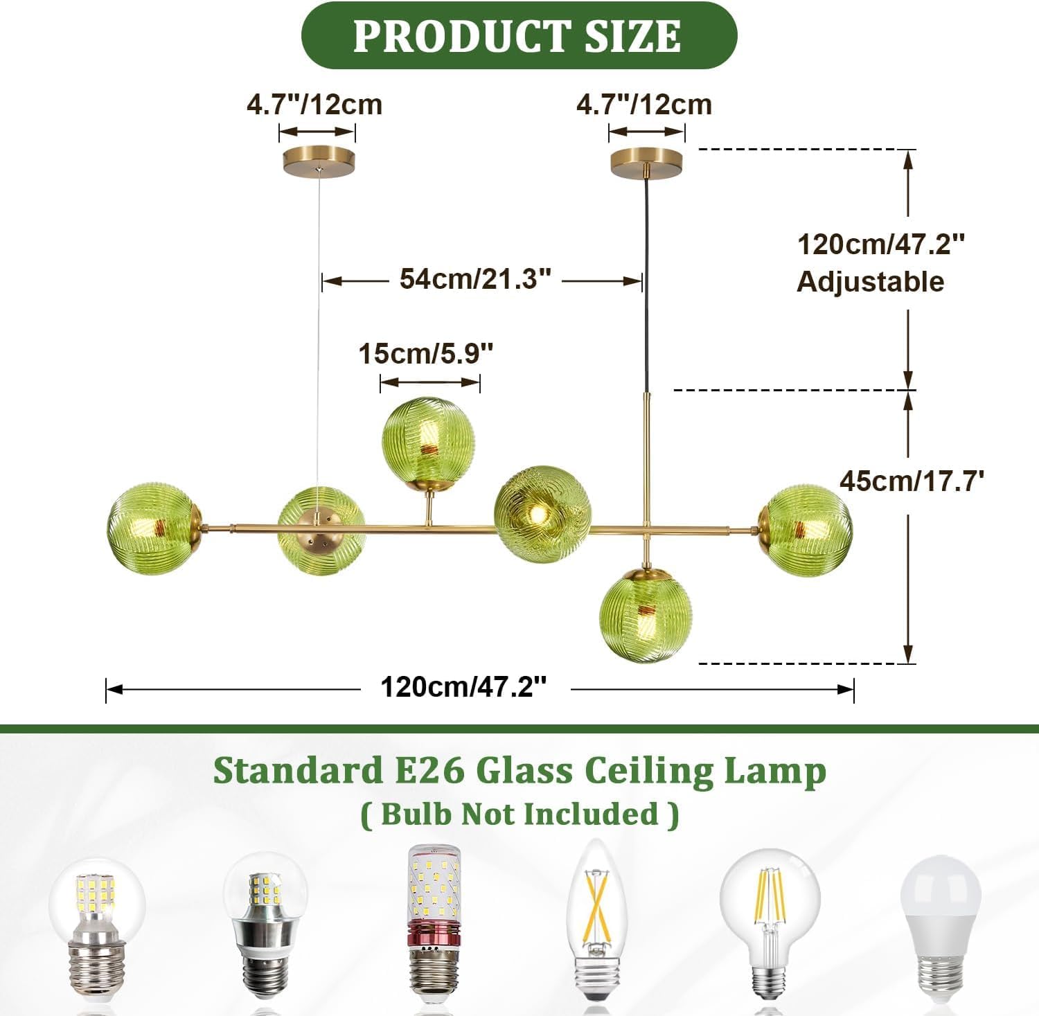 - Farmhouse Long Pendant Chandelier: The linear globe chandelier features a simple linear design with brushed gold finish and 6 green glass shade. The sputnik island lights for kitchen have an vintage look but also a fresh farmhouse style, can bring your space a noble feeling