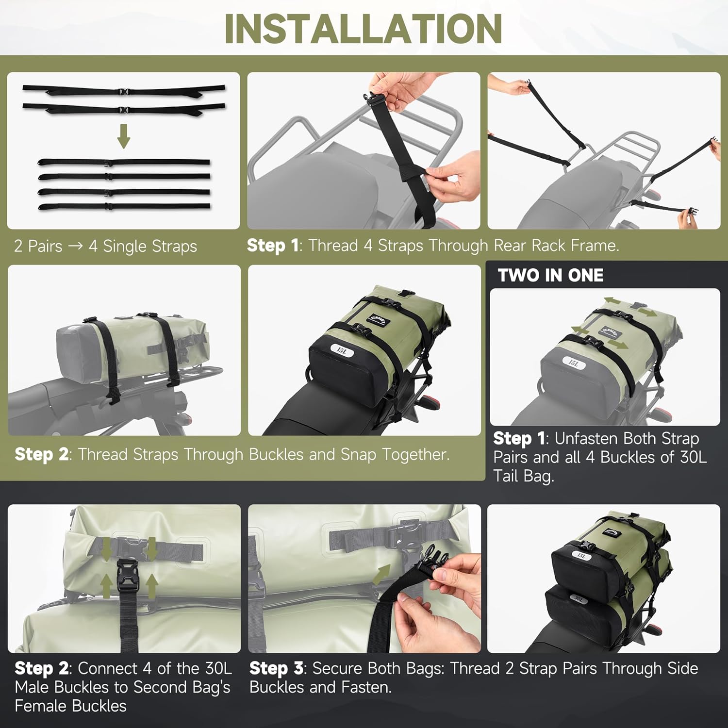 - Rider-Optimized Functional Design. The Gurblofy motorcycle tail bag is engineered with the rider in mind: Its heavy-duty PVC construction withstands all weather conditions, while storm-proof zippers ensure secure closure. The pack features quick-adjust buckles for instant sizing, and our patented textured handle design delivers a firm grip even with gloves. Multi-position straps distribute weight evenly across your back for fatigue-free riding adventures.