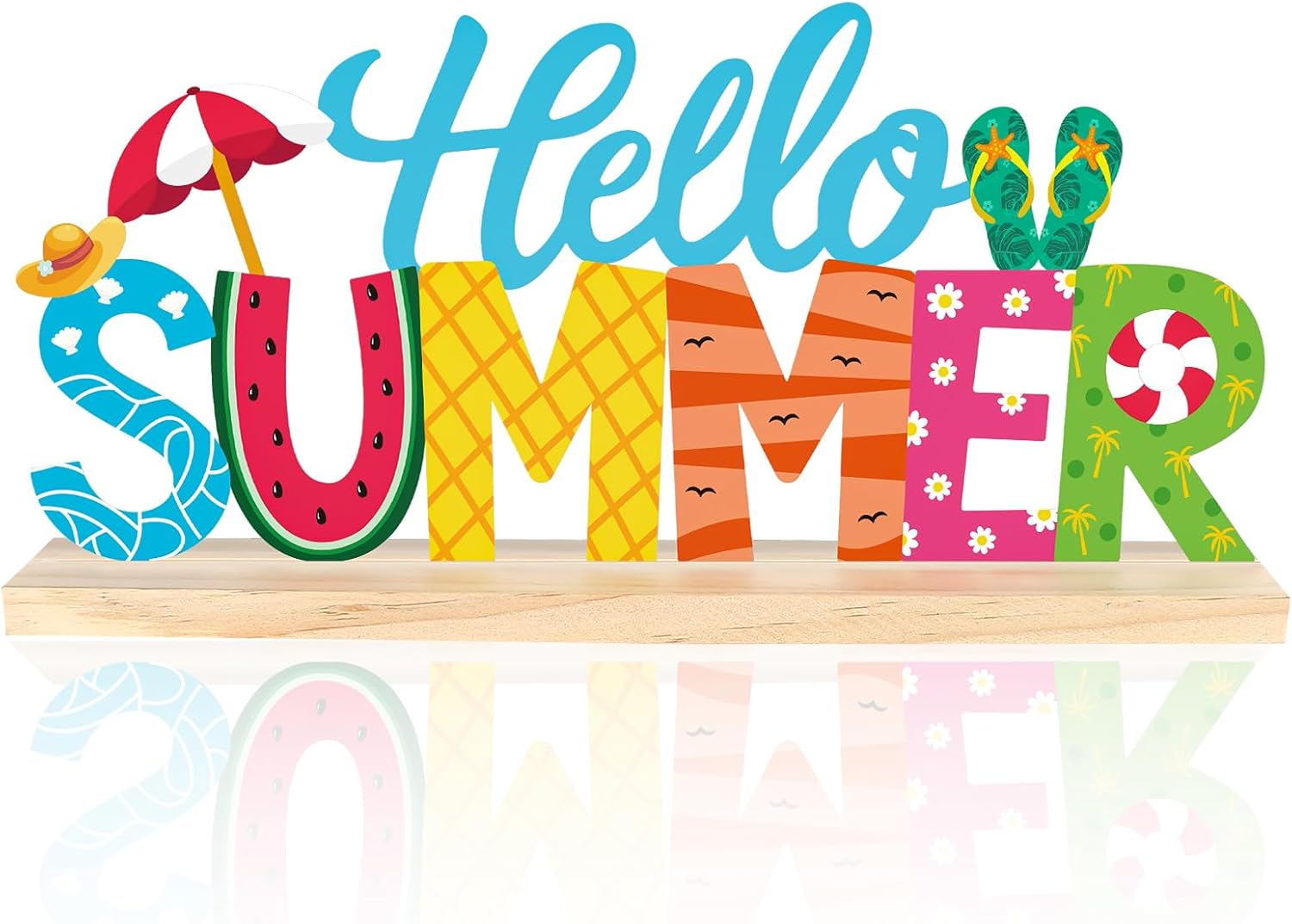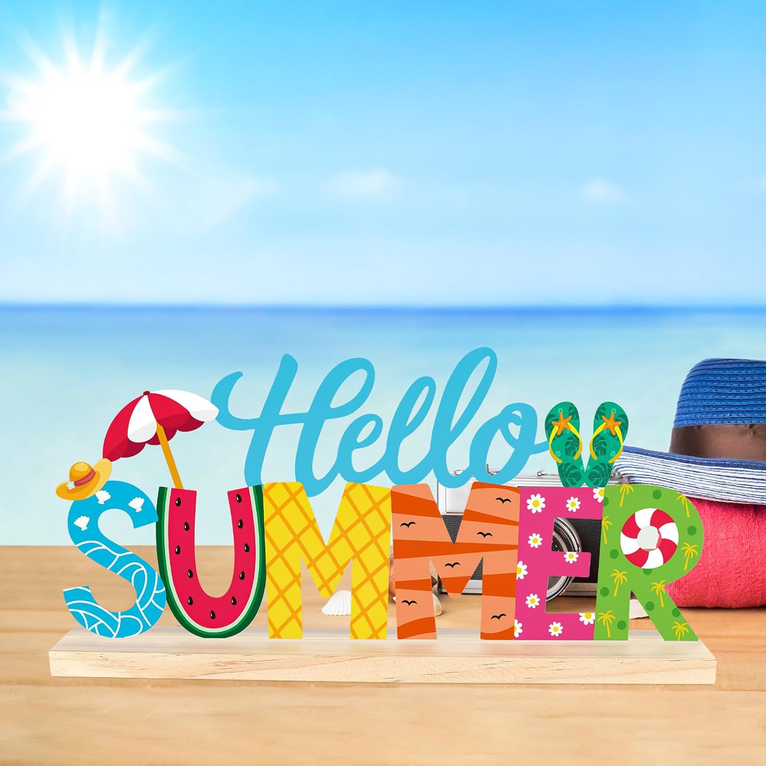 - Beach Style Colorful Hello Summer Party Decor - Our adorable Hello Summer signs are painted in high quality. When you using it, just insert the text part above into the base. This can easily become an eye-catching dining table centerpiece.
