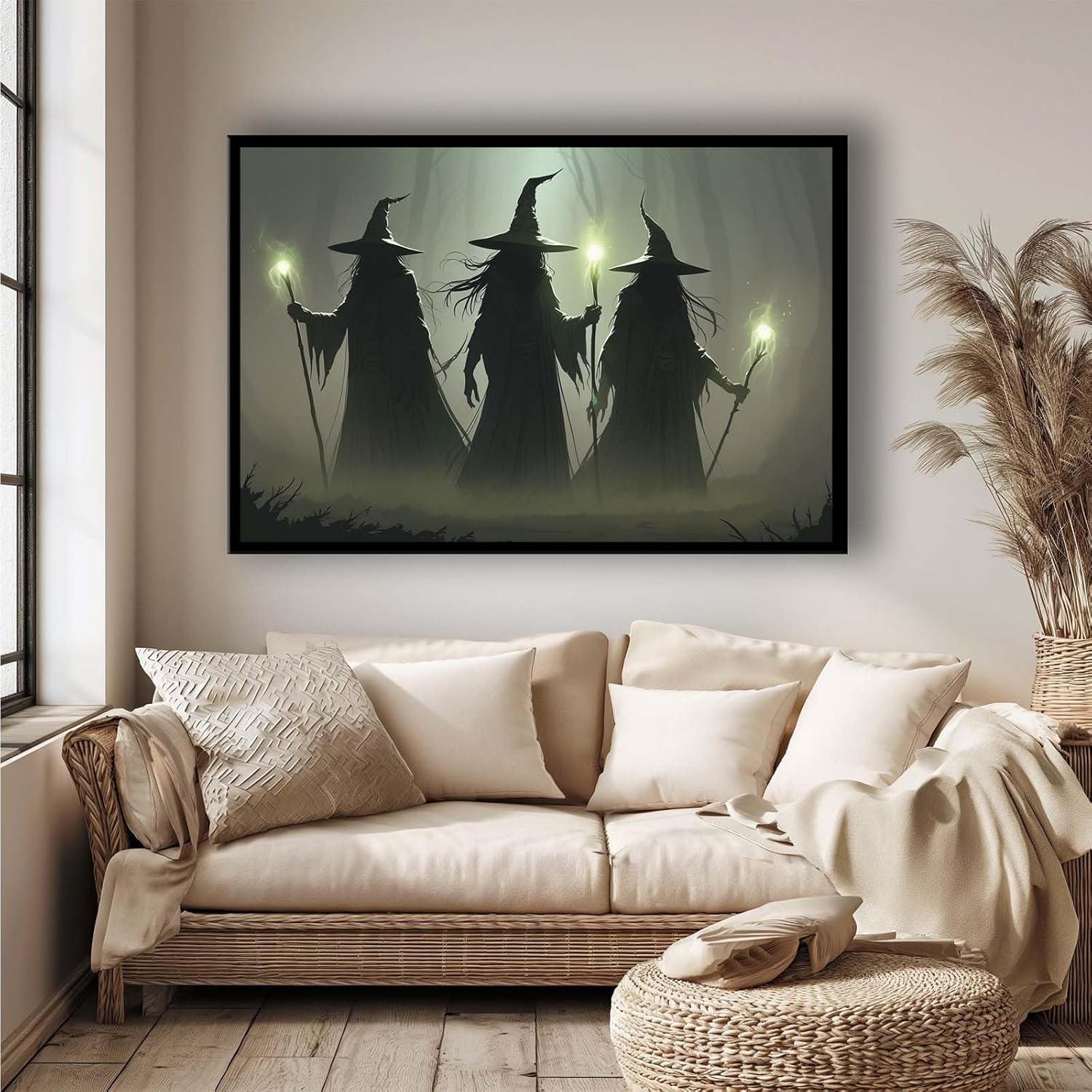 JFHCQJPK Vintage 3 witches canvas wall decor melancholy dark Halloween poster wall decor holding a staff print Gothic horror Halloween painting print for living room bedroom20x30in Metal blackFramed