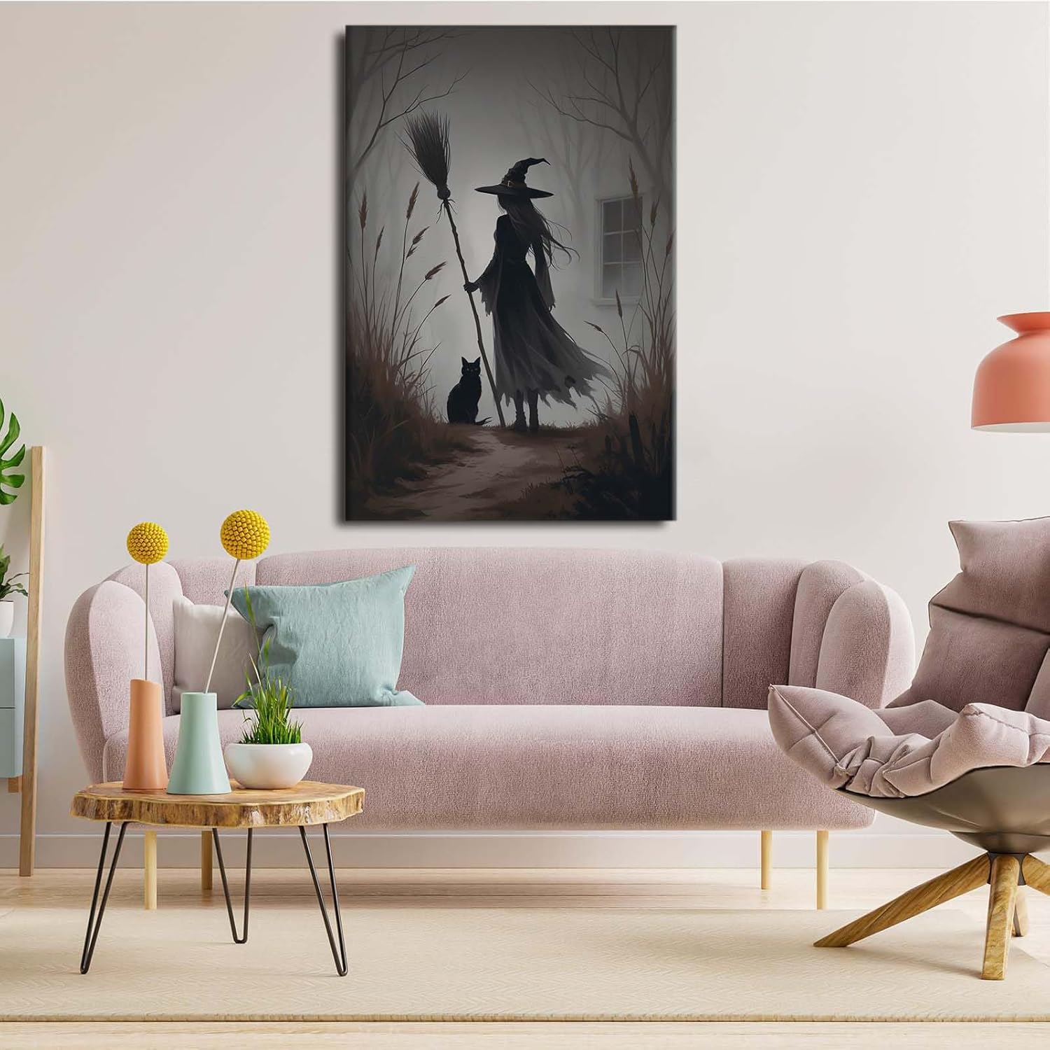 Vintage forest witch and black cat poster Halloween mural poster decoration mural art magic suitable for home living room bedroom8x12in Wood Framed