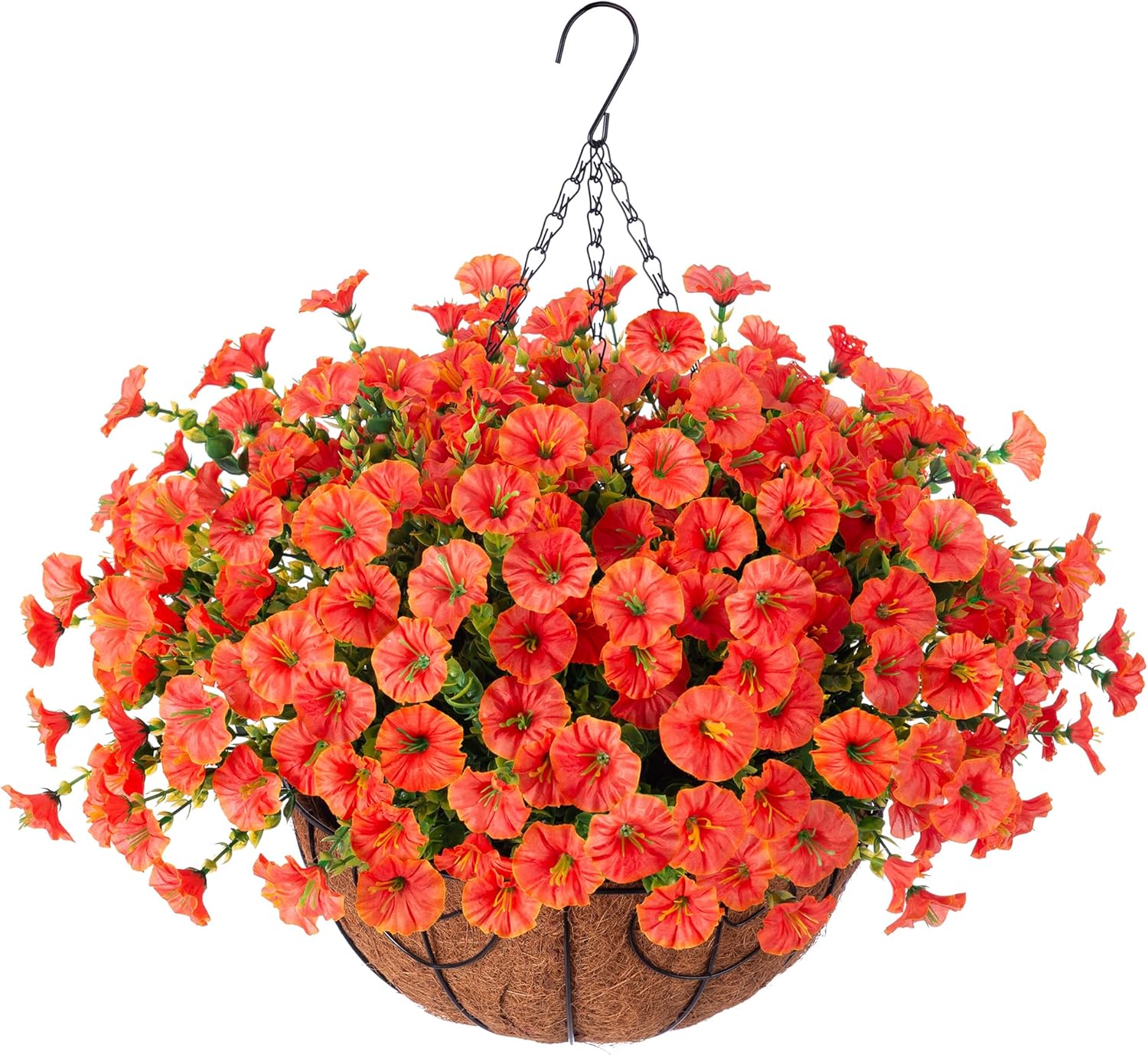 - Artificial Hanging Flowers Basket with Morning Glory: Package include 12 bundles realistic silk morning glory match with green eucalyptus leaves, 1 Hanging Basket with chain, 1 foam, 1 green hat. Enjoy vibrant blooms year-round, regardless of the season or weather conditions.