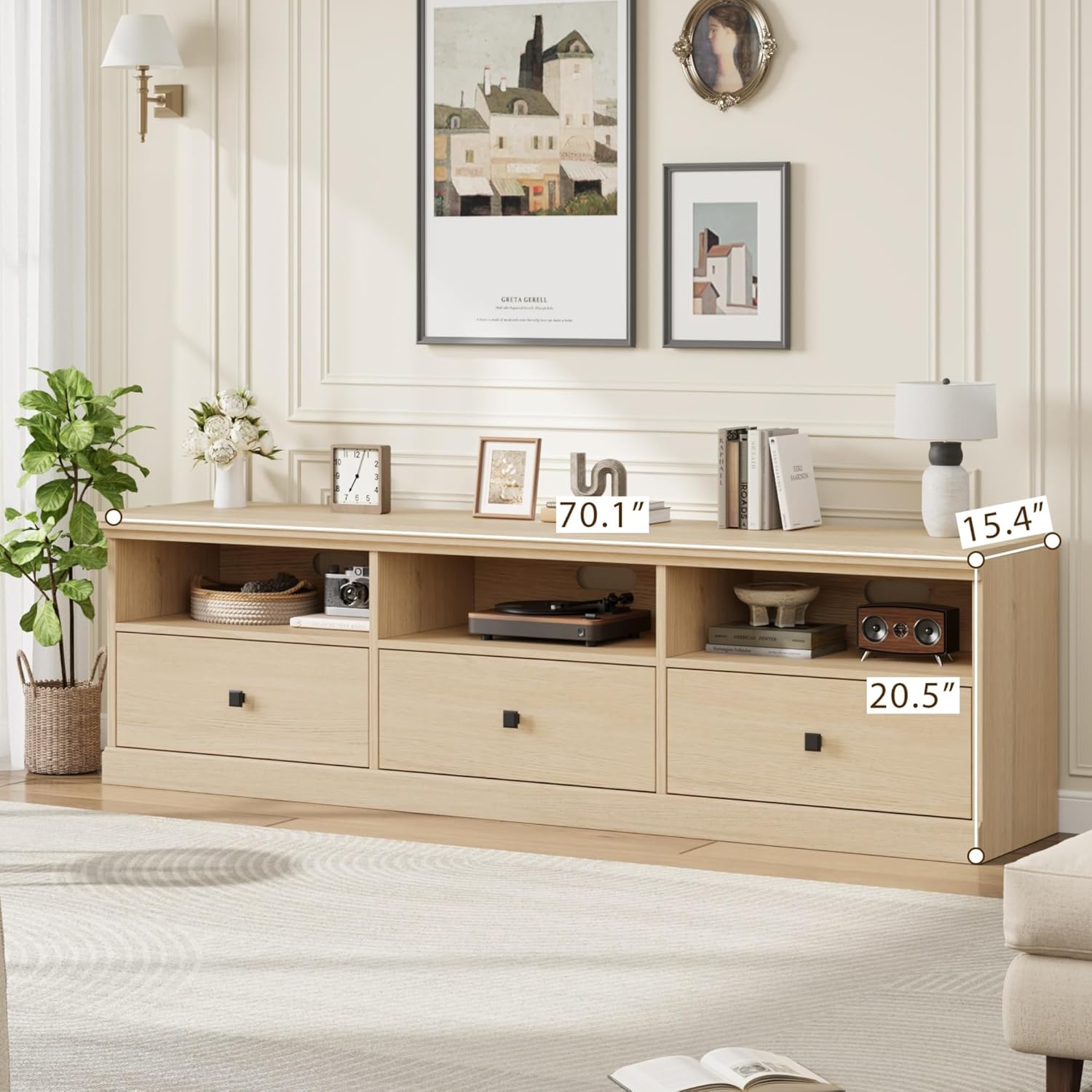 - DIMENSIONS & STORAGE: This tv cabinet measures 70” L x 15.4” W x 20.5” H and accommodates flat or curved TVs up to 75 inches. The tv console table provides ample storage space with a combination of open shelves for decor and media devices, plus drawers to neatly stow away remotes, cables, and other essentials