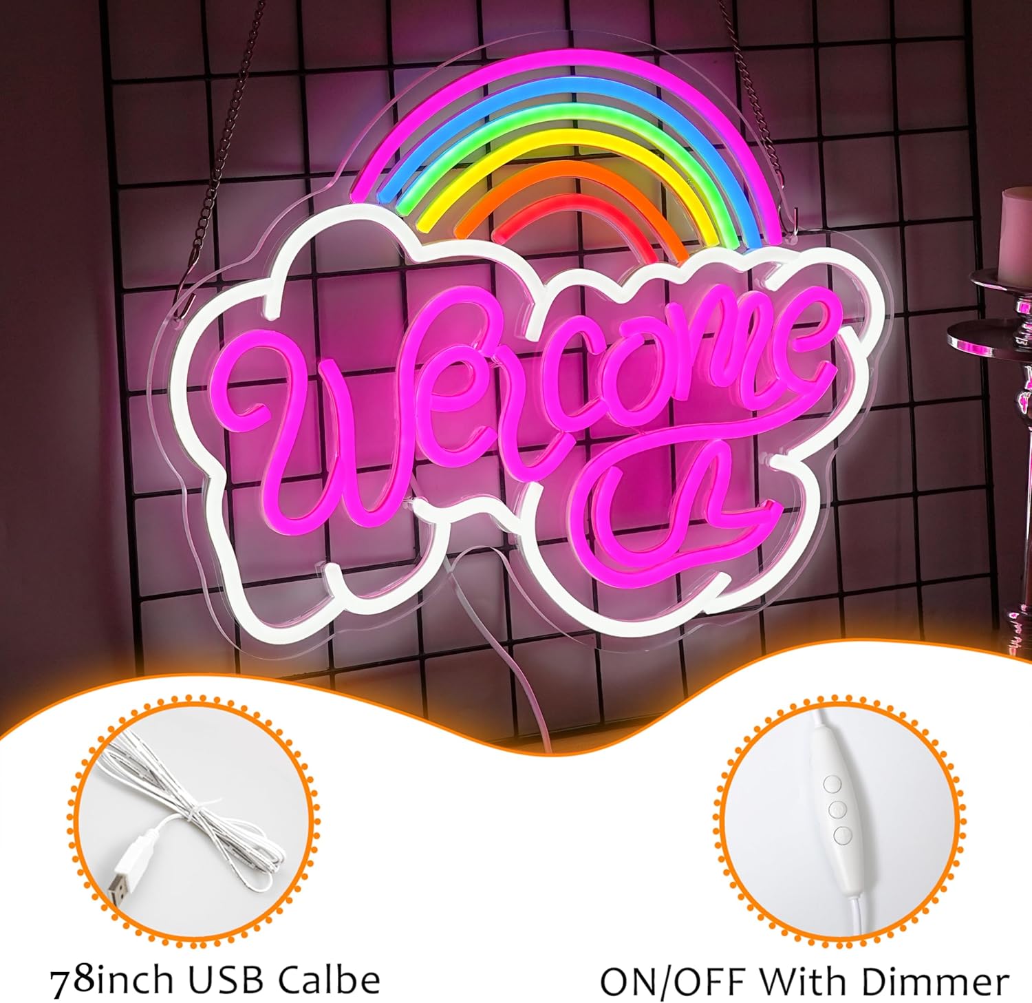 LISIGNVE Rainbow Welcome Neon Sign Cloud Light Up Sign Welcome Led Sign Rainbow Neon Light with USB for Bedroom Wedding Party School Business Wall Decor (16.5”*12.6”)