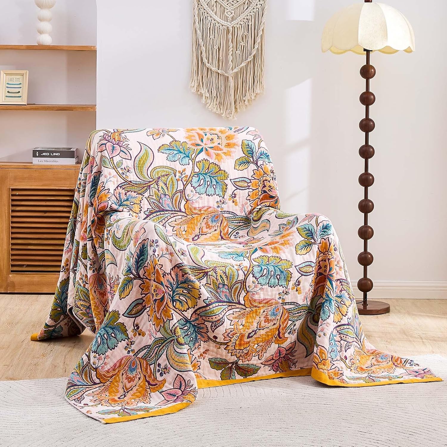 Boho Throw Blanket for Bed, 100% Cotton Soft Rustic Quilt Fall Blanket, 60"x80" Floral Printed Farmhouse Decor Bed Blankets, All Season Rustic Reversible Bohemian Throw Quilt
