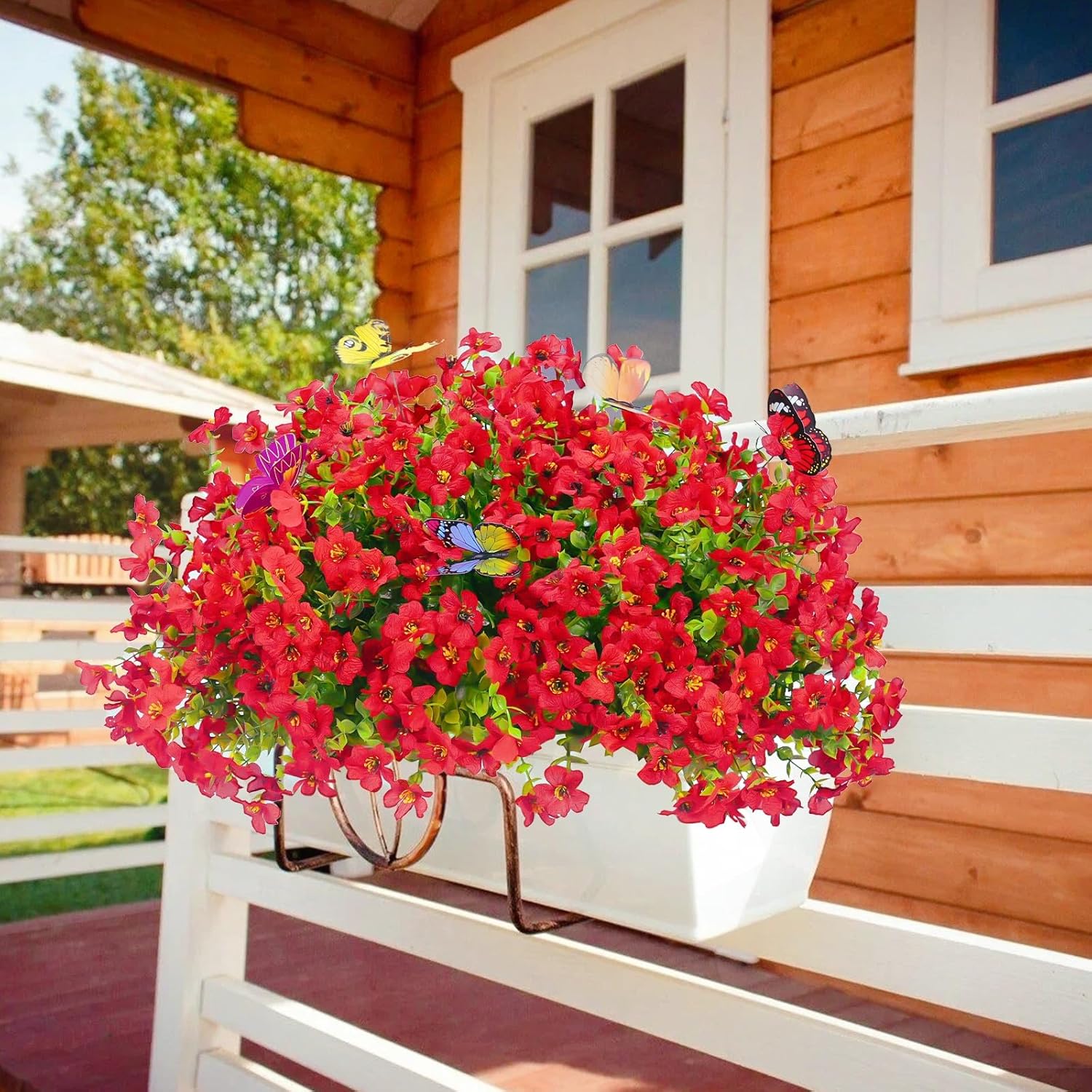 20 Bundles Artificial Flowers for Outdoors with 6 Faux Butterflies, UV Resistant Fake Flowers with Eucalyptus Leaves, Artificial Plants Outdoor for Patio Garden Porch Home Decor (Red)