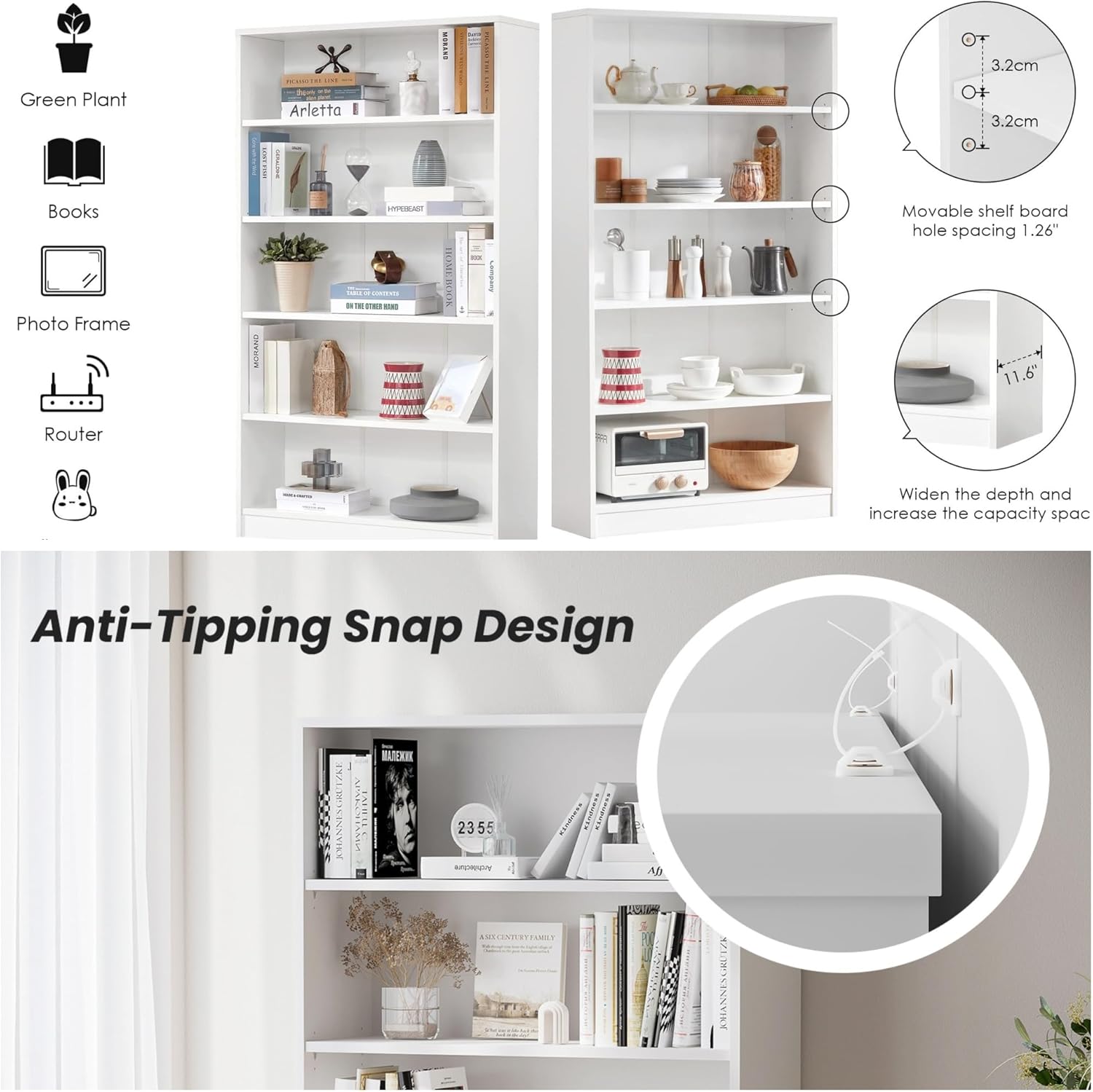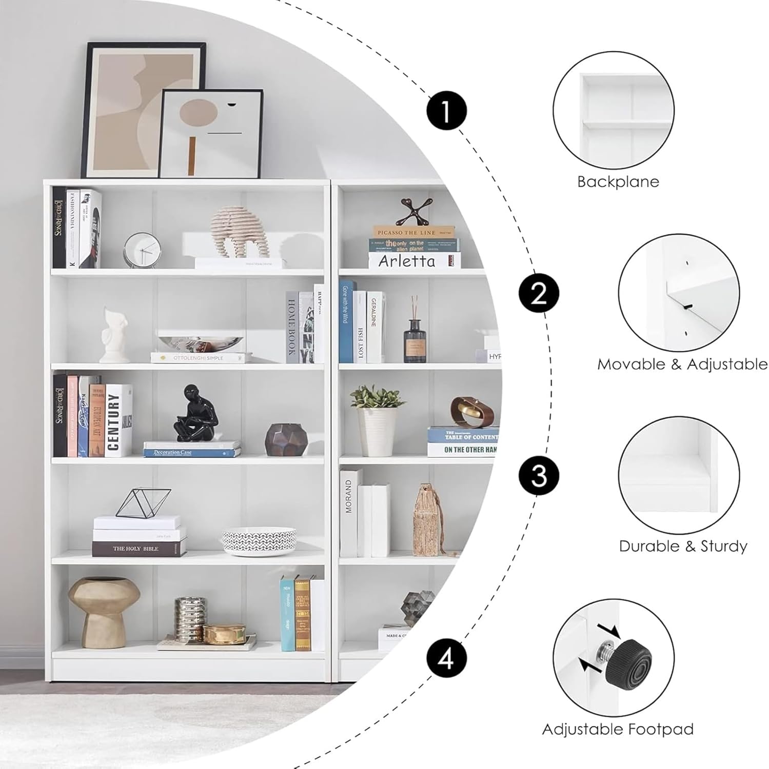 Bookshelf, Open Modern Bookshelf, 5 Shelf Bookcase with Freestanding Display Storage, Wooden Book Shelf for Bedroom, Living Room, Dinning Room, Office, 60 Inch, White