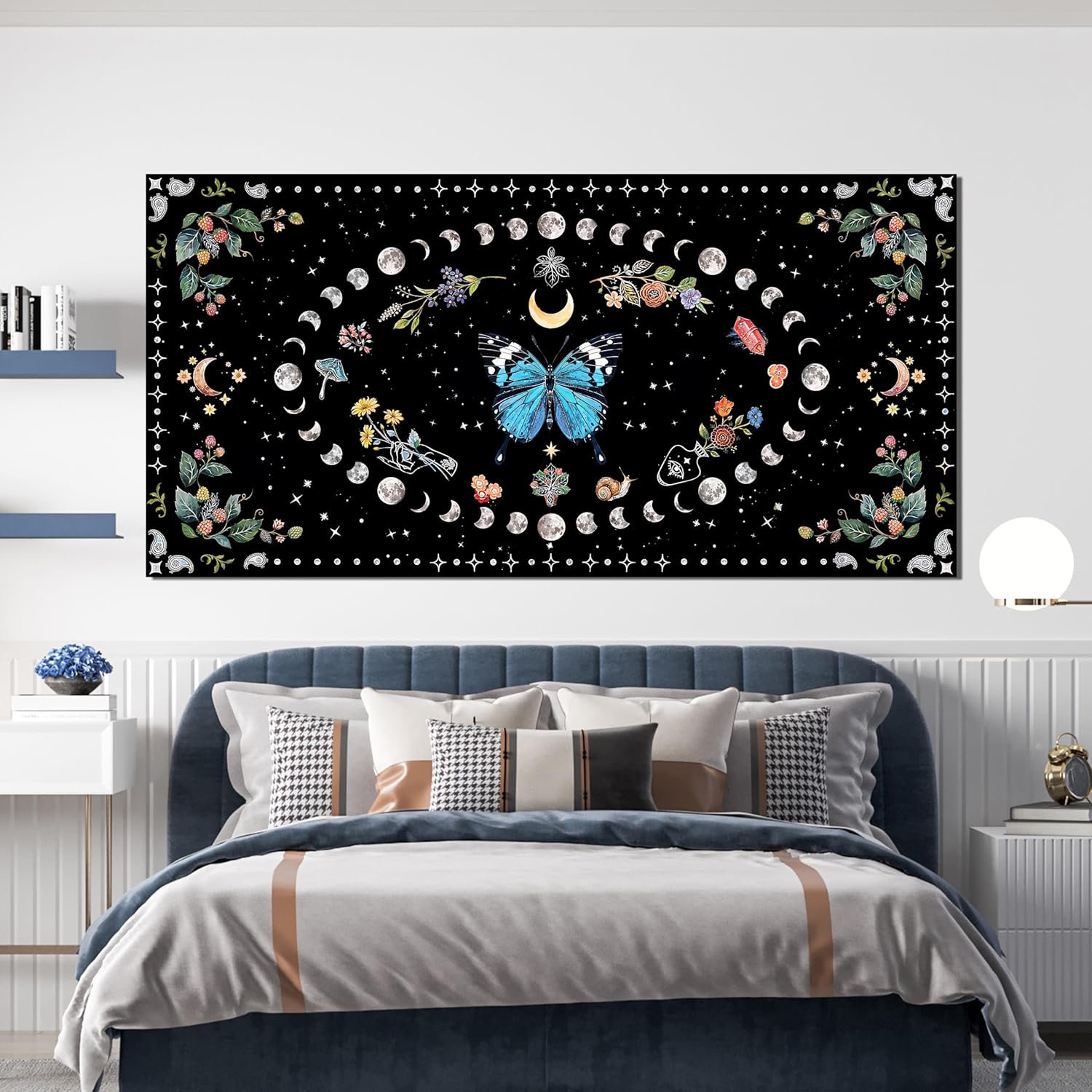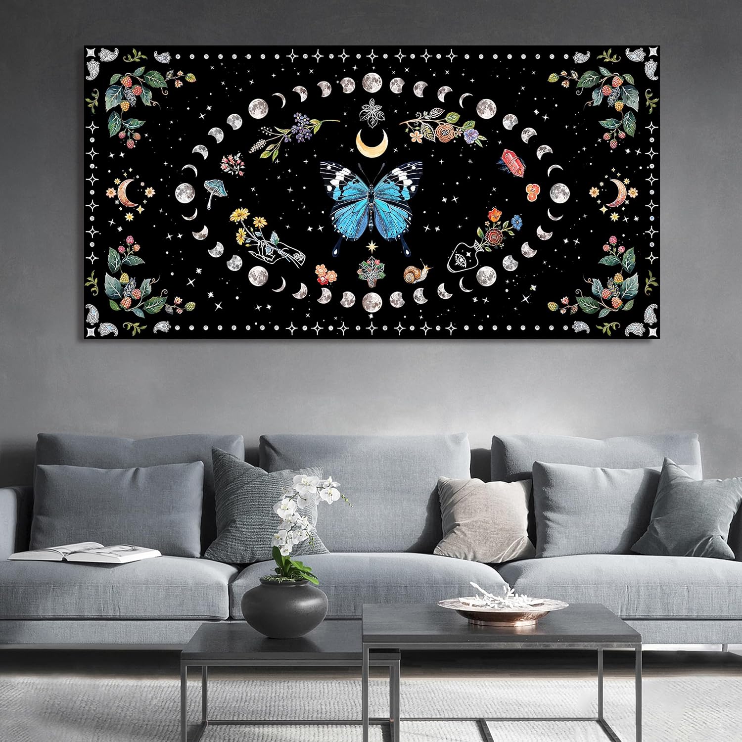 Large Canvas Wall Art Blue Boho Wall art Decor Canvas Art Wall Decor Wall Pictures for Living Room Vintage Butterfly Wall Art Moon Flower Prints Large Artwork for Walls Home Room Decor 29" X 58"