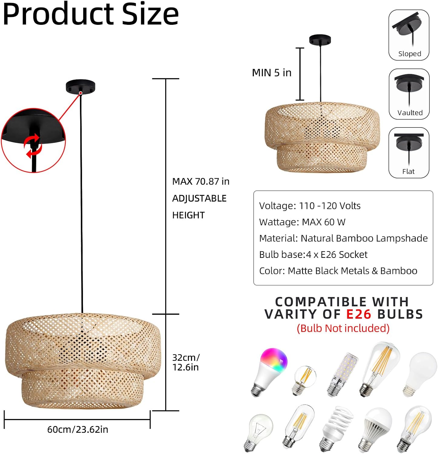 - 【Bulb Requirement】Size 60 * 32 cm, 26.62" * 12.6", Voltage 110v~240v, Bulb socket and electric cord have passed the UL listed, which can ensure that you use them safely. US standard E26 base socket, maximum 60W, suitable for Incandescent, LED, halogen, CFL, etc.(Bulb Not included)