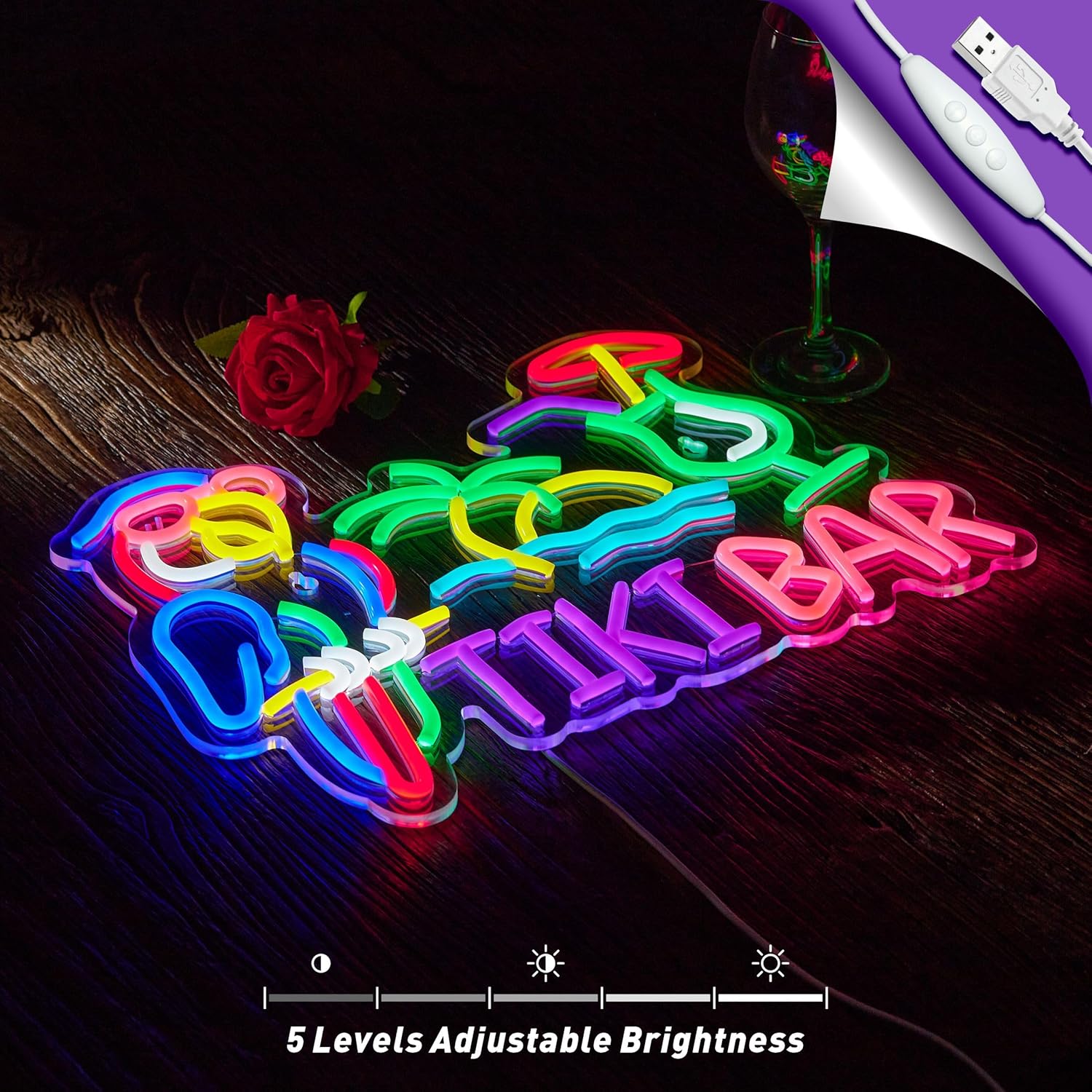 - 【Cool design】Creative sunglasses parrot palm tree tiki bar neon sign. Made of soft silicon LED strip lights and clear acrylic board. Well made and packed.