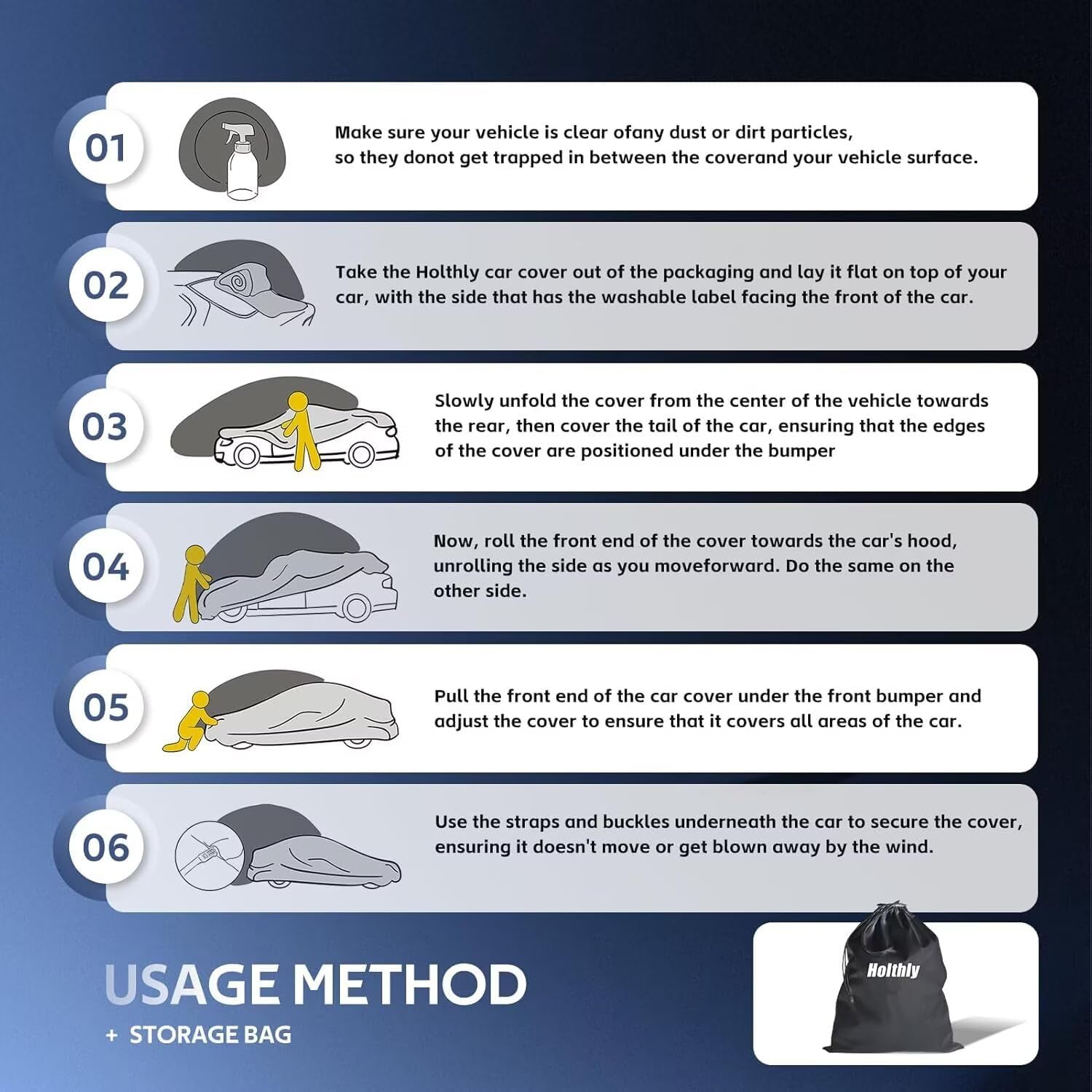 - 【Product Details】 -1.The Holthly car cover features three pairs of reinforced windproof straps to keep it securely in place, even in high winds.2.A spacious storage bag is included for easy folding and transport in your trunk.3.Double stitching along the edges ensures greater durability.4.Four reflective strips are added to enhance visibility and help prevent accidental collisions at night.
