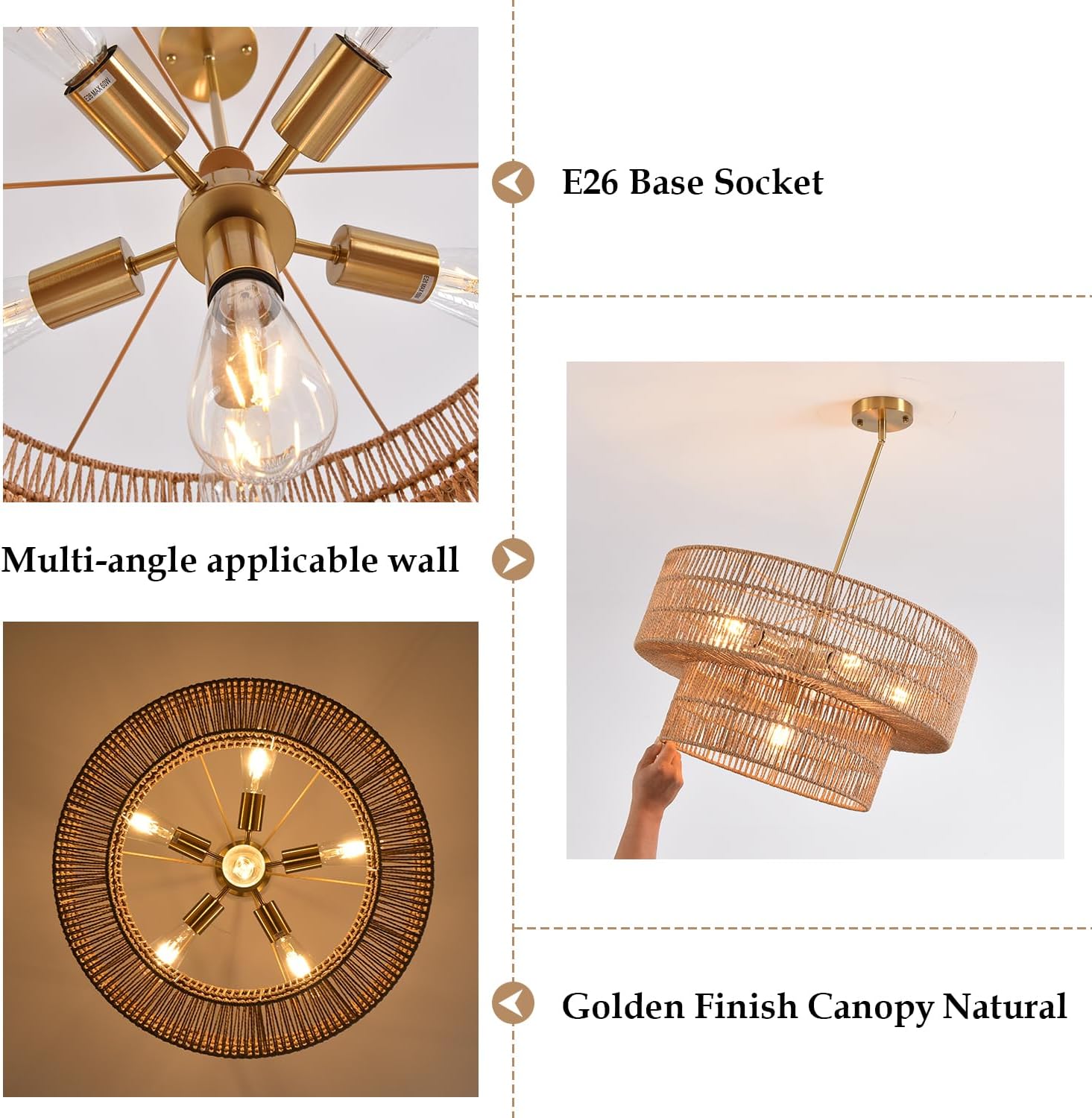 - Versatile & Safe Bulb Compatibility - Rattan farmhouse chandelier features 6* E26 sockets, accommodating bulbs like incandescent, halogen, and LED (60W Max, Not Included). Dimmable with compatible bulbs and switches.It could be dimmable if you install compatible dimmable bulbs and switch then you could install with warm white 3000k, neutral white 4000k or cool white 6000k bulbs as you like