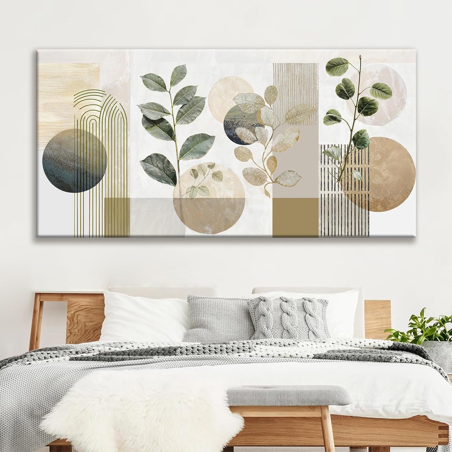 TAIJXAGSG Large Boho Green Wall Art For Living Room 29x58 In Green Botanical Boho Wall Art Modern Sage Bohemian Canvas Art Wall Decor Natural Abstract Geometry Lines Prints Picture Ready To Hang
