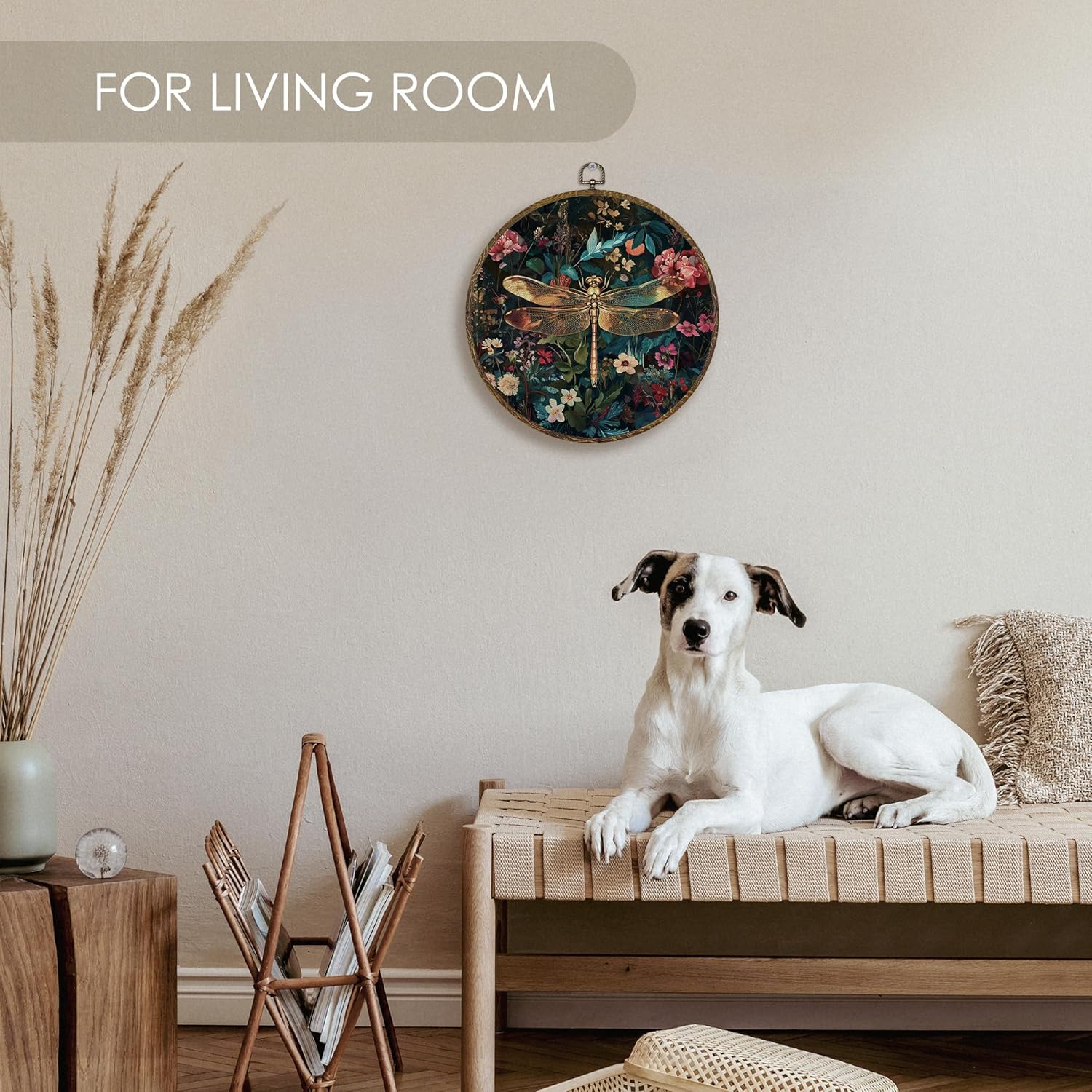 Fewgb Vintage Dragonfly Round Wall Art Decor Framed for Gallery Bedroom Living Room Kitchen Bathroom, Dark Black Floral Canvas Wall Art Prints Picture, Flower Hanging Room Decor Artwork 10x10