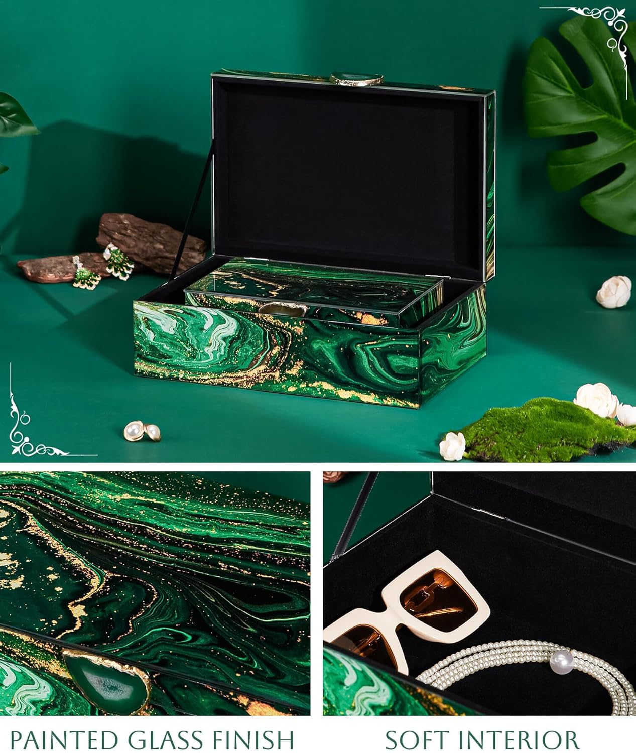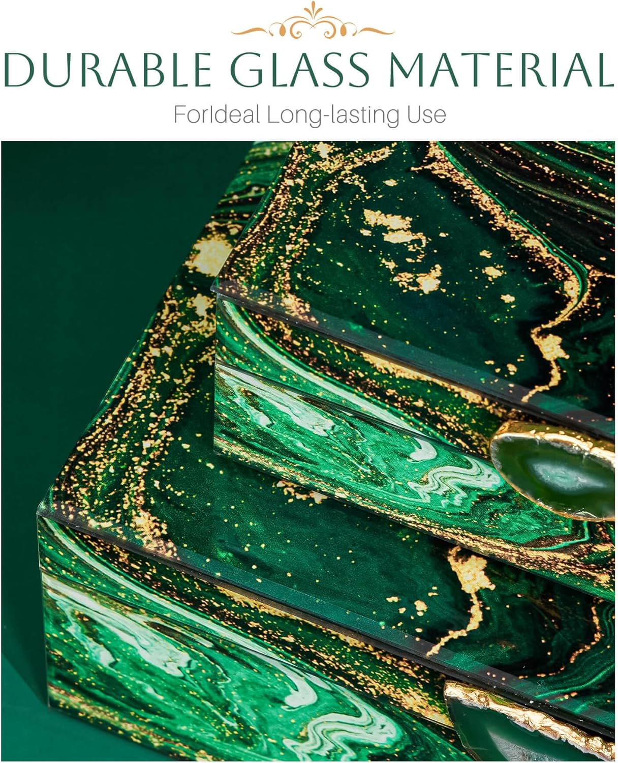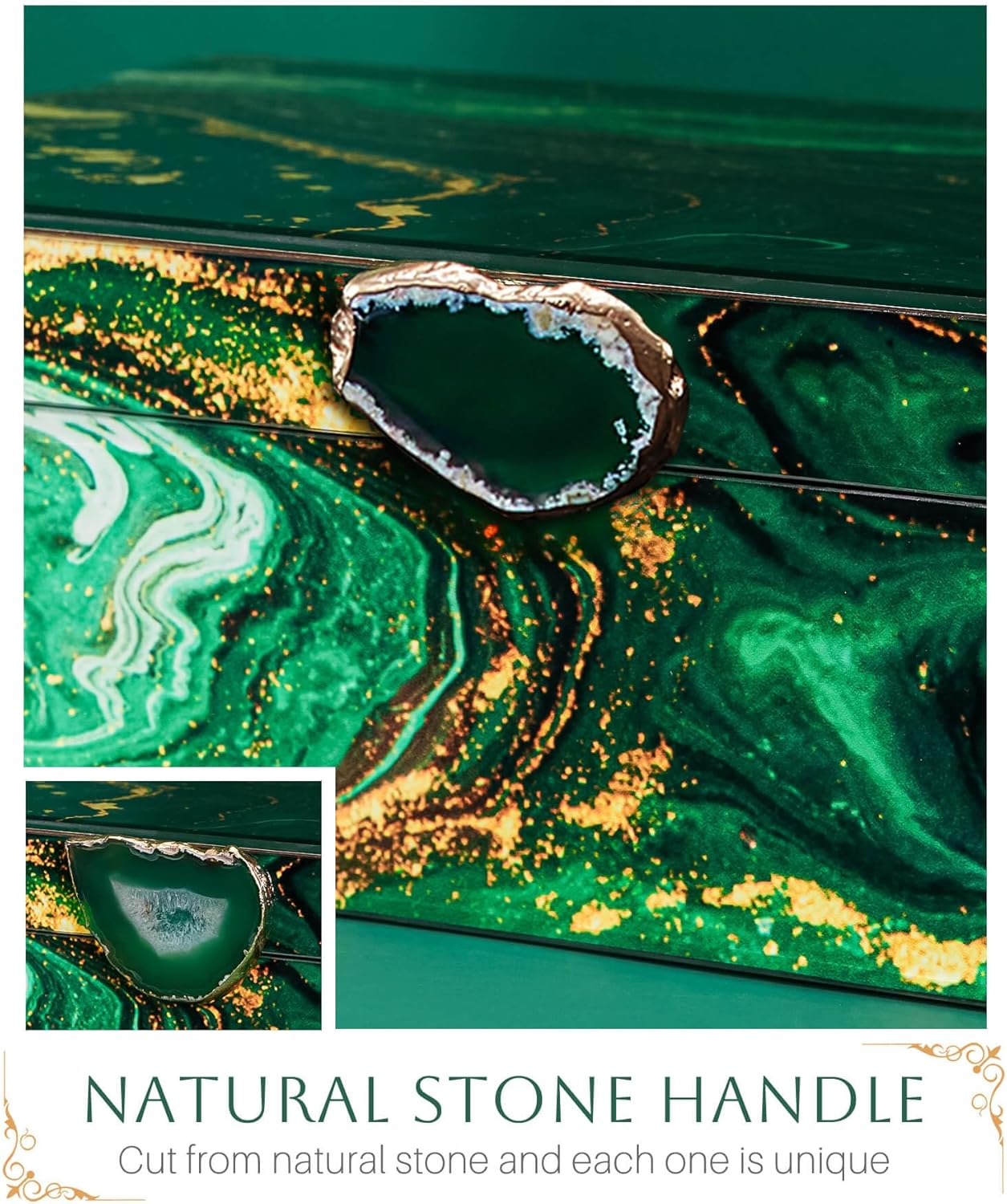 - Stunning Decorative Boxes: These decorative boxes are not just storage containers; they are works of art. The harmonious blend of green and gold on the outer frame creates a vibrant forest-like landscape, enhanced by unique stone handles. A perfect fit for modern home decor, these boxes will add a touch of elegance to any room