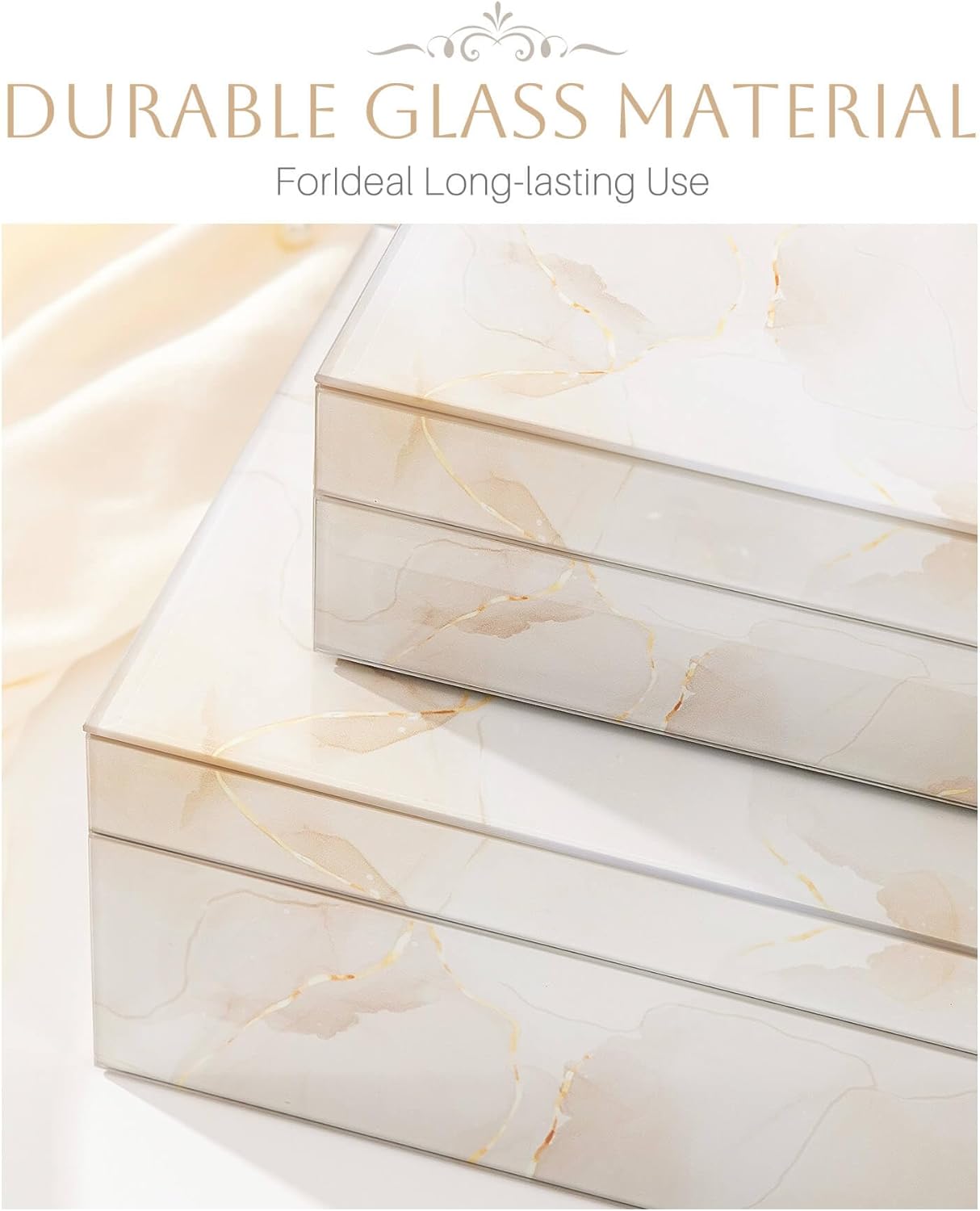 - Premium Quality Decorative Box Set: This set includes two beautifully crafted decorative boxes. The outer frames are made of luxury glass material, while the inner linings are soft velvet, ensuring durability and a luxurious feel. The large box measures 11.10×7.44×4.02 inches, and the small one is 8.35×5.08×2.83 inches. Ideal for storage, organization, or as a stylish keepsake, these boxes are a must-have for any home
