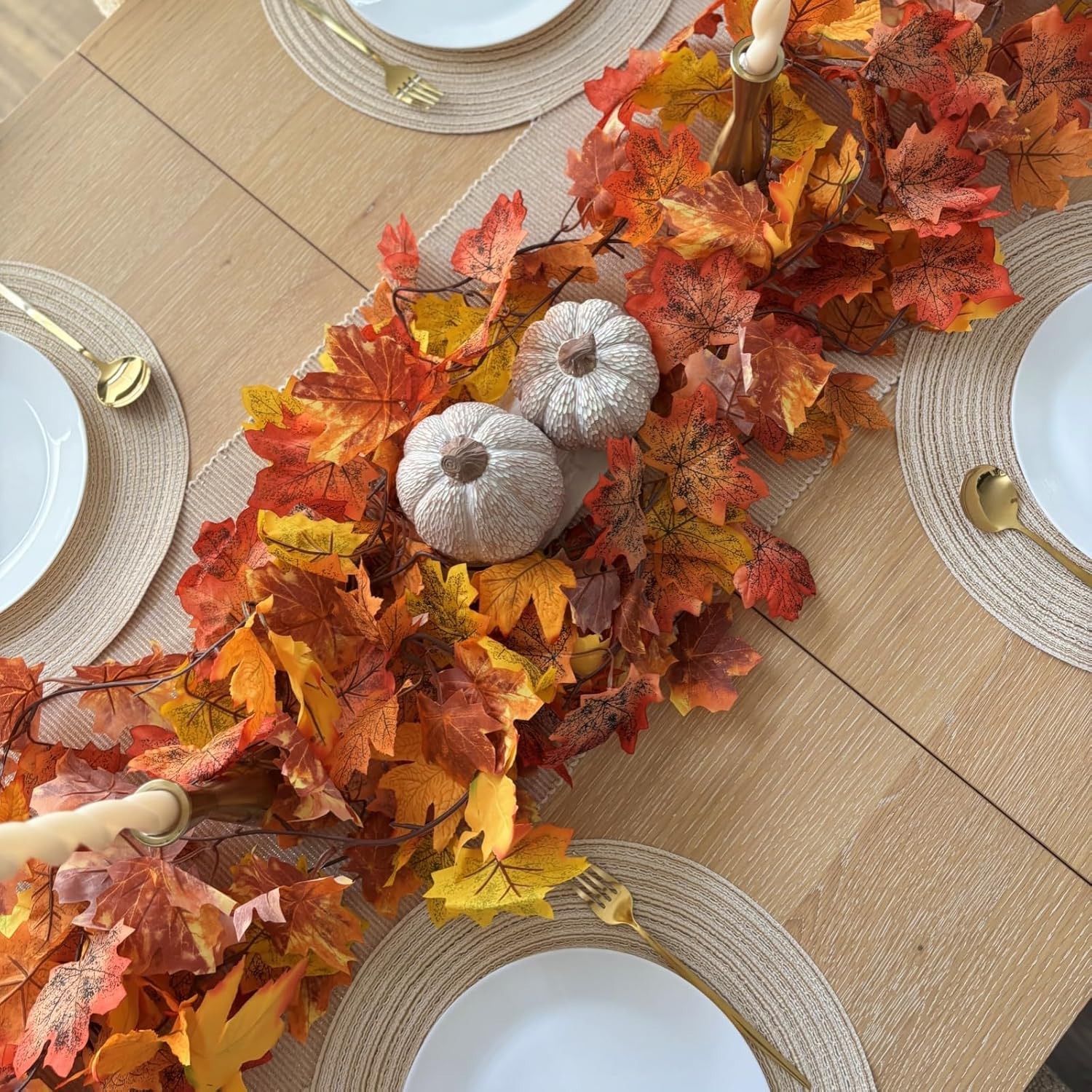 - DURABLE and REUSABLE: Sturdy and texture clear fall leaves garland are made of fabric, stems are made of plastic, but looks like real fresh preserved fall Garland which is lightweight,no wilting, fading or get easily damaged. and adapt to all kinds of weather. fall maple leaves does not require any sort of special care.
