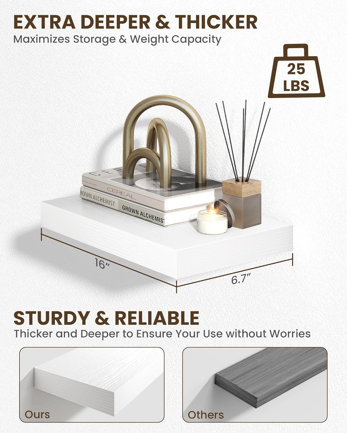 - Sturdy & Reliable: Robust construction floating shelves for wall supports everyday items (books, decor, bathroom essentials, kitchen spices) with stability, combining practicality with timeless style