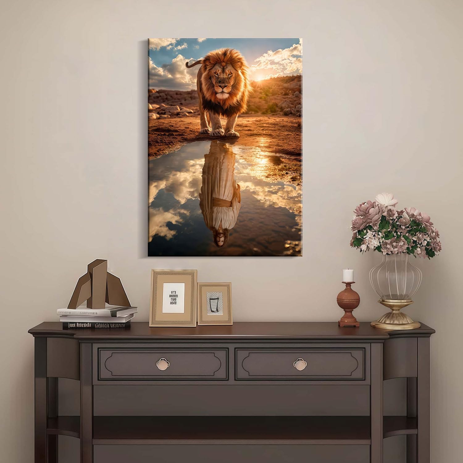 - Meaningful Faith-Inspired Art Featuring a powerful lion standing by a pool with the reflection of Jesus, this symbolic canvas wall art conveys themes of courage, faith, and inner strength.