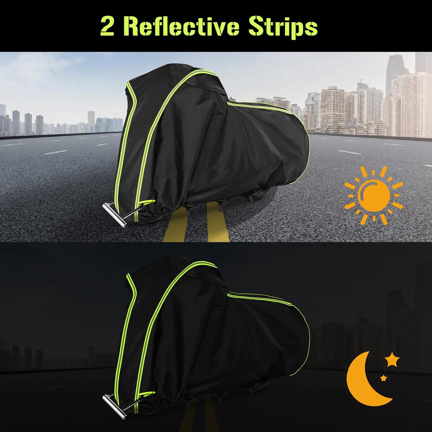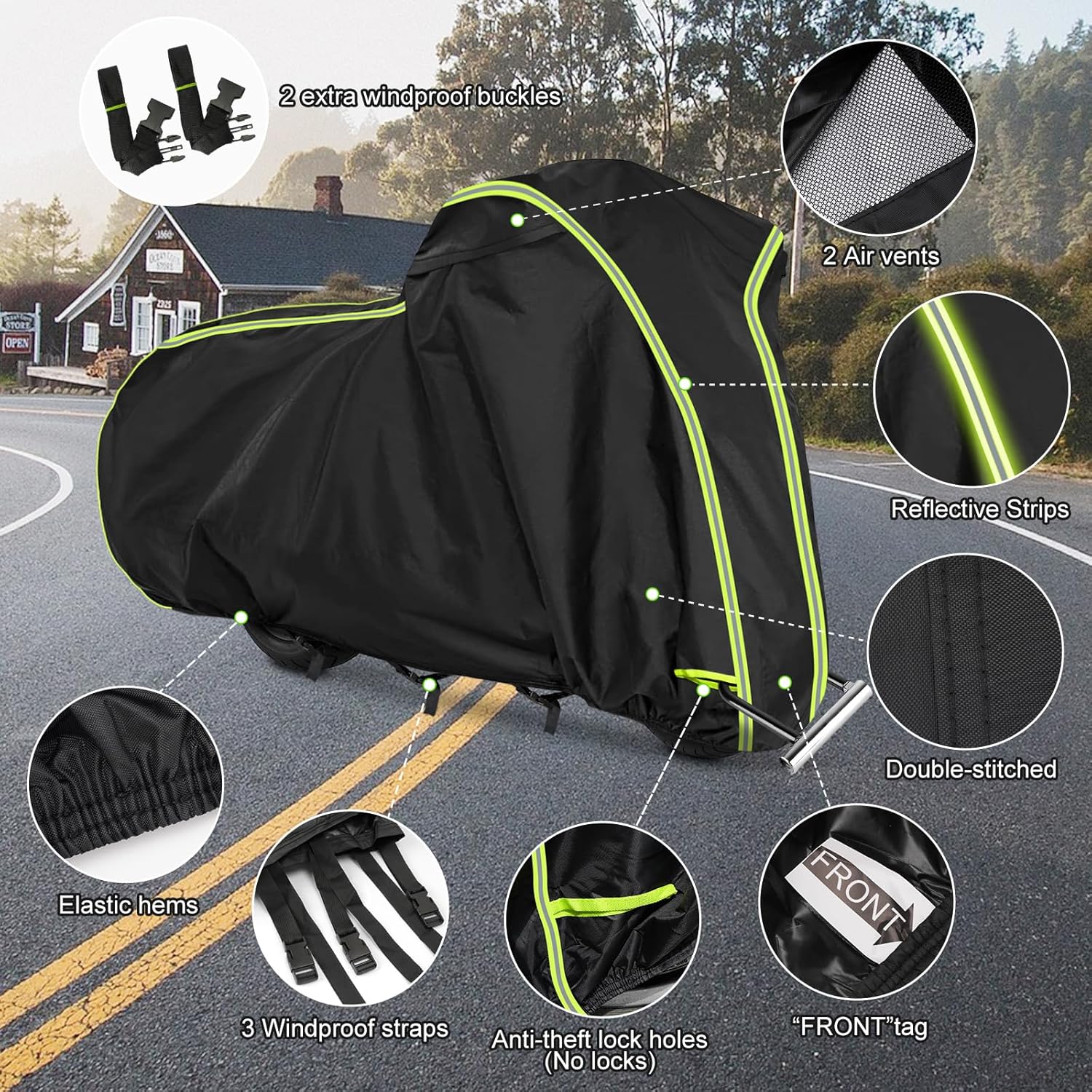 - 【Unique Designs】Two air vent holes prevent moisture under the cover. Waterproof Black PU Coating: UV protection and heat-proof, prevent cracking and aging of inner decoration leather and plastic. 3. Two full Green Reflective Strips to prevent collisions during the night. It comes with a “FRONT” sign, 4 Anti-theft lock holes(No locks), and a storage bag.