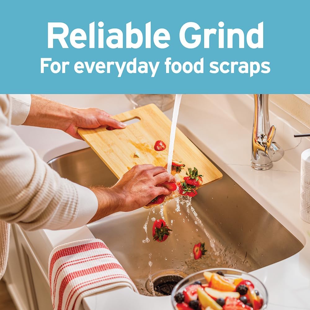 - RELIABLE GRIND: Sink disposal with 1/3 HP MAGNADRIVE permanent magnet motor¹ and Single Stage Grind for everyday kitchen food scraps; rugged, galvanized steel grind components that are more than 12% heavier than leading permanent magnet motor brands