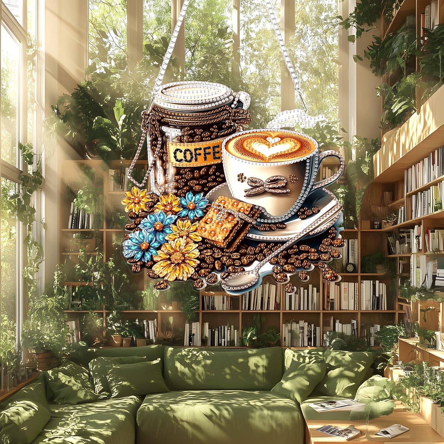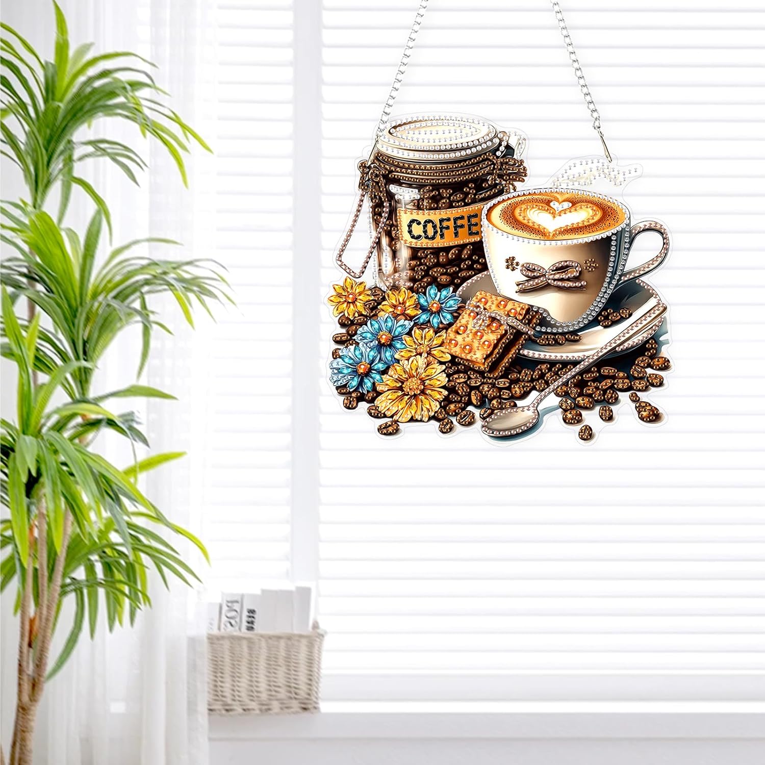 Lxmsja DIY Coffee Beans Diamond Painting Hanging Ornament, Double-Sided Acrylic Flowers Diamond Art Kit, Special Shaped Drill Pendant Window Art Kit, Suncatcher Hanging Craft Decoration 8x8 inch