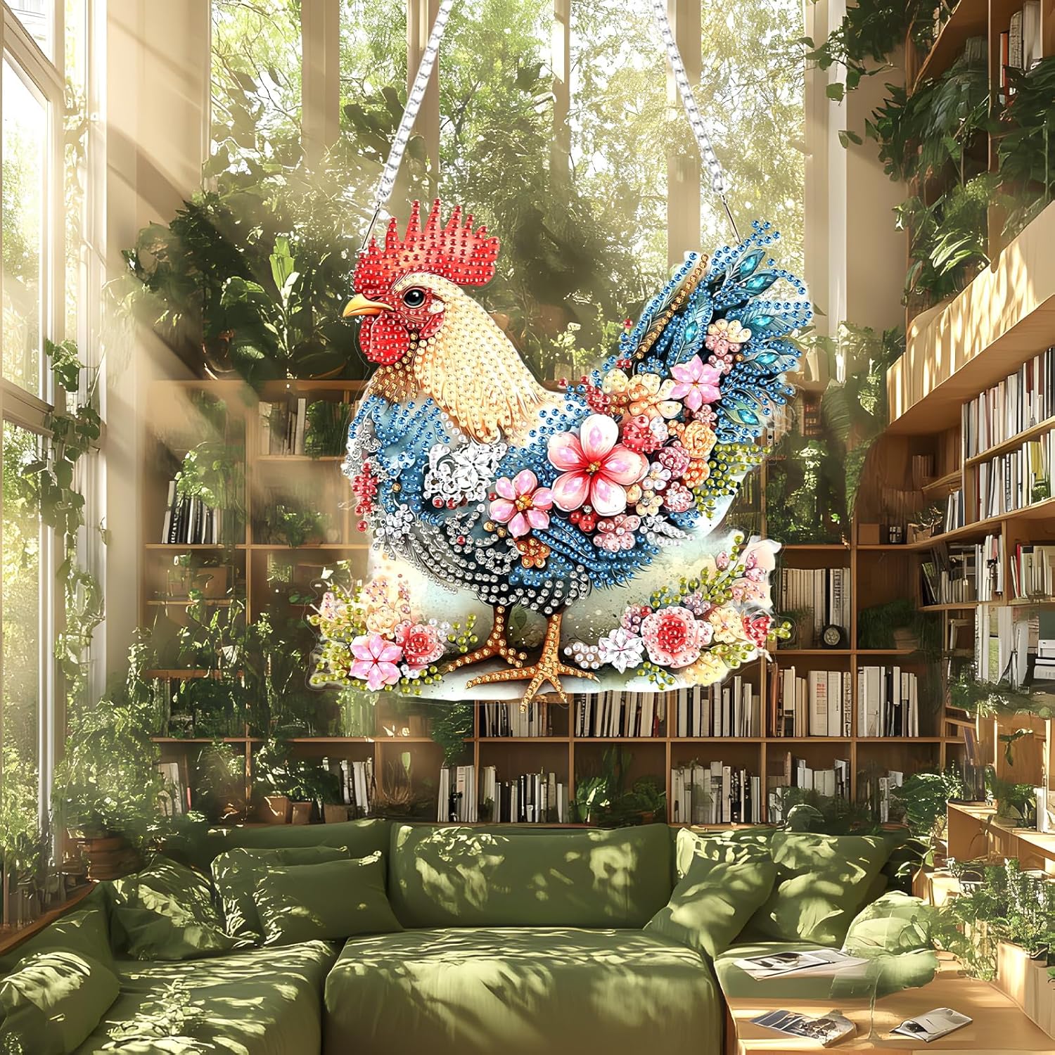 Lxmsja DIY Chicken Flowers Diamond Painting Hanging Ornament, Double-Sided Acrylic Sceney Diamond Art Kit, Special Shaped Drill Pendant Window Art Kit, Suncatcher Hanging Craft Decoration 8x7 inch