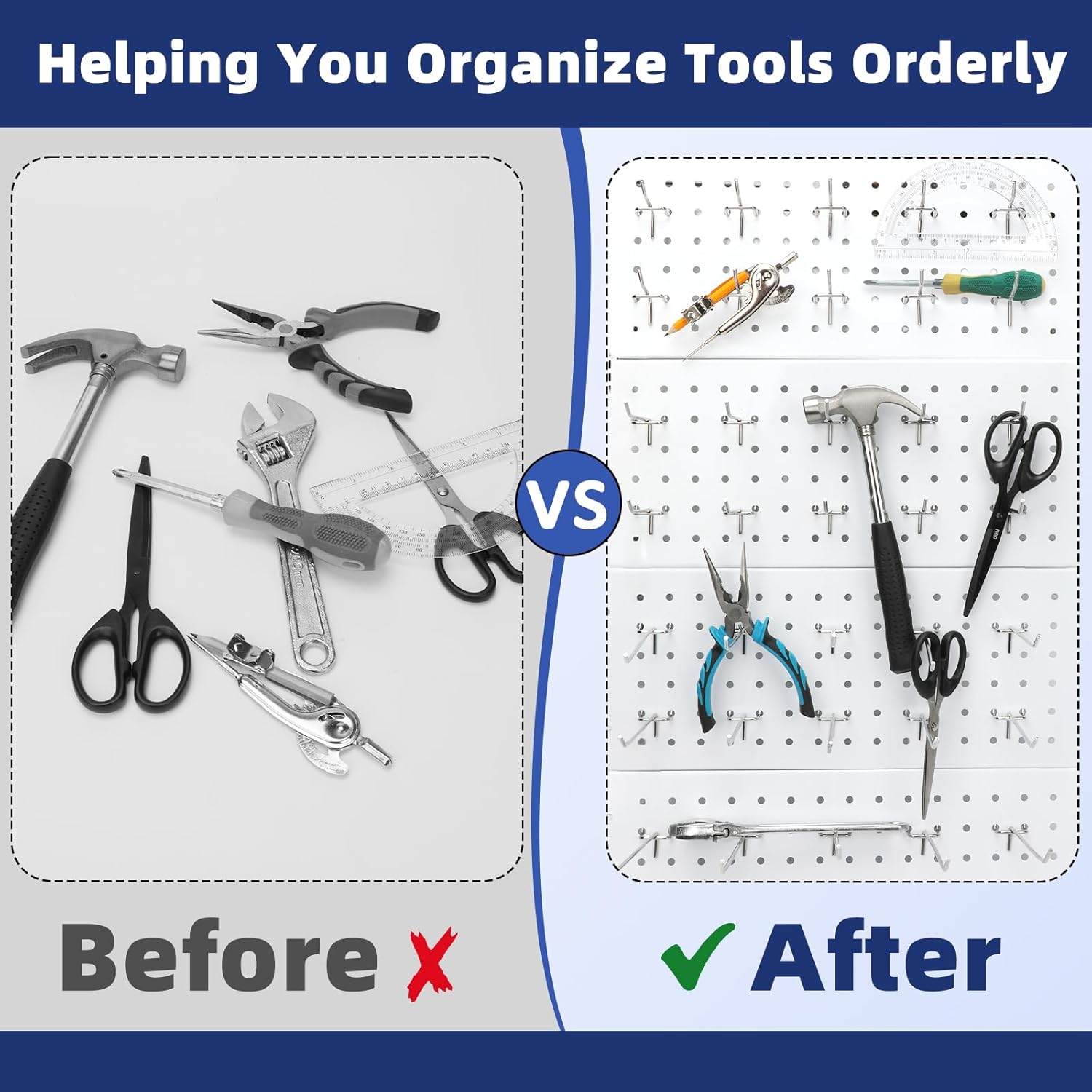 - Easy To Use: These hanging pegboard hooks easily insert into small holes without wobbling and can be removed without extra tools. Our pegboard tool hooks make your space look neat and professional