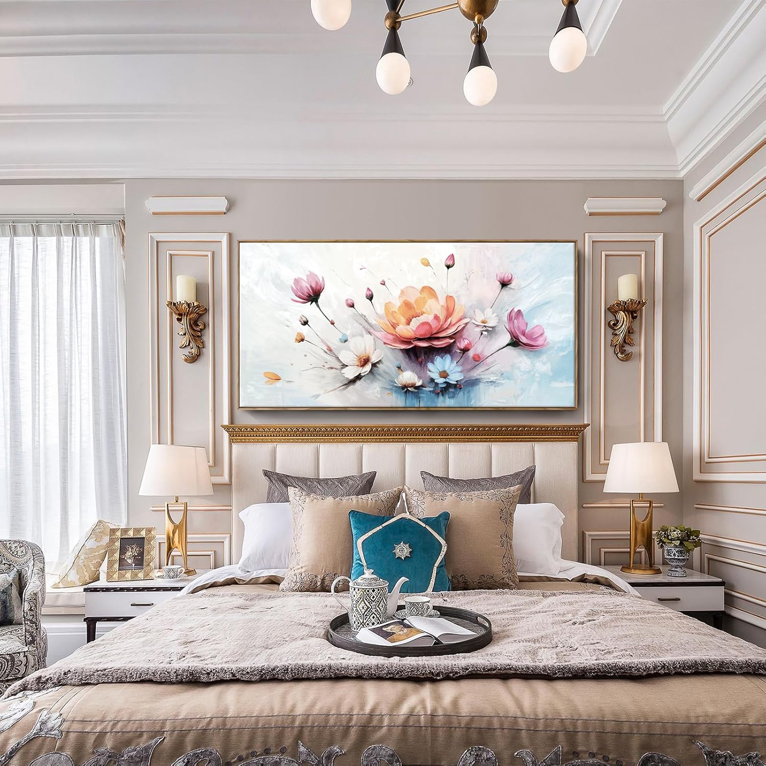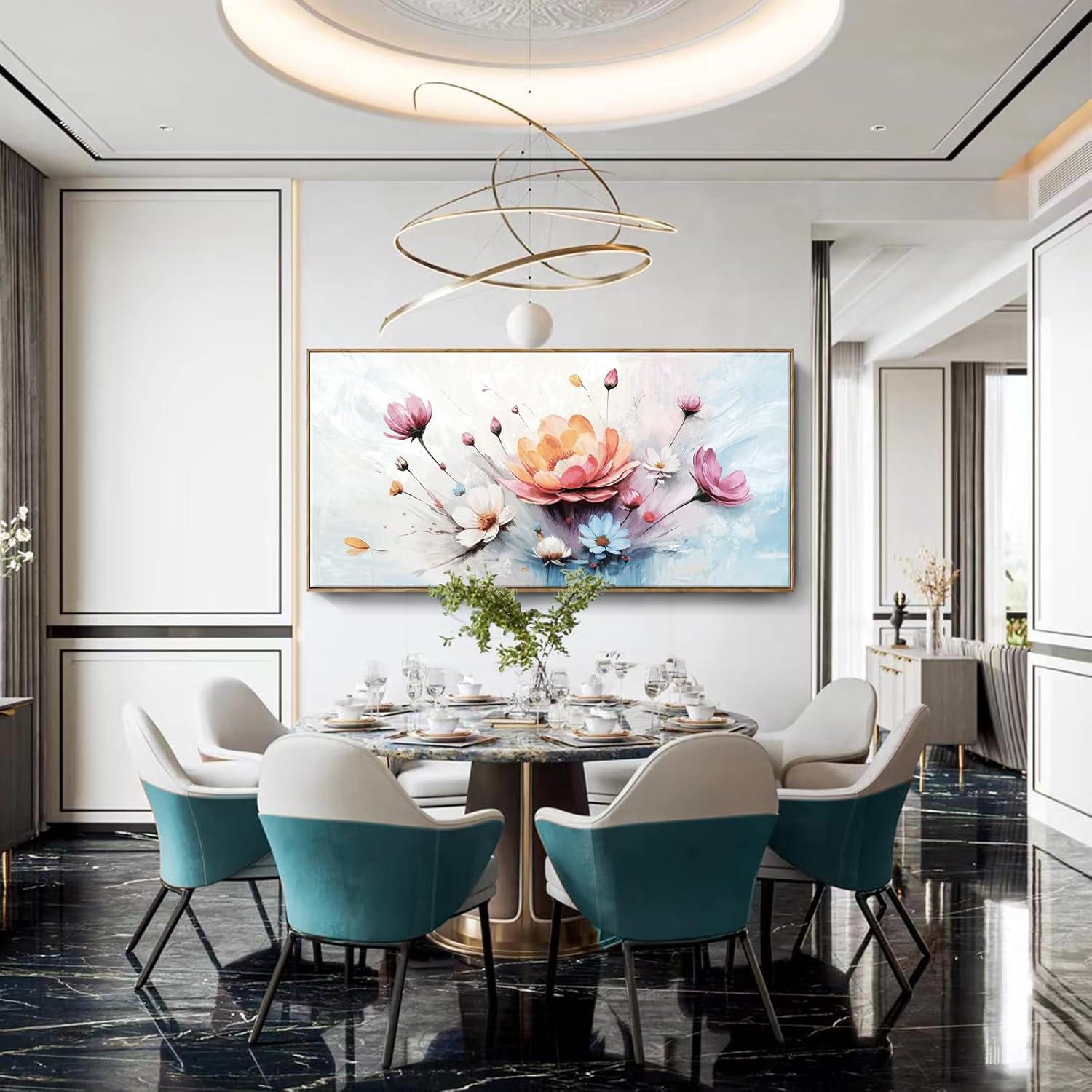 - An Eye-Catching Symphony of Color and Bloom: This oversized framed floral canvas features a bold central bloom surrounded by delicate blossoms and buds in soft pink, white, blue, and orange hues set against an abstract gradient background. It beautifully expresses life’s unfolding beauty. Let this artwork inspire calm, hope, and positivity, encouraging you to embrace change and bloom where you are planted.