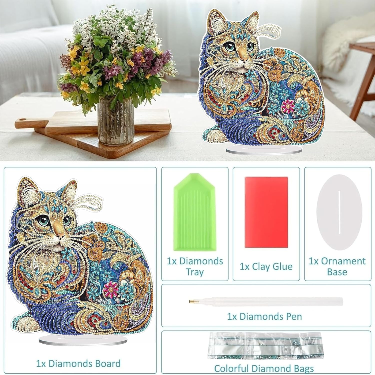 Diamond Painting Kits for Adults Beginners, 5D Full Drill Cat Crystal Art Desktop Ornament, DIY Single Sided Home Office Desk Decor, Creative Craft Gift Set with Tools