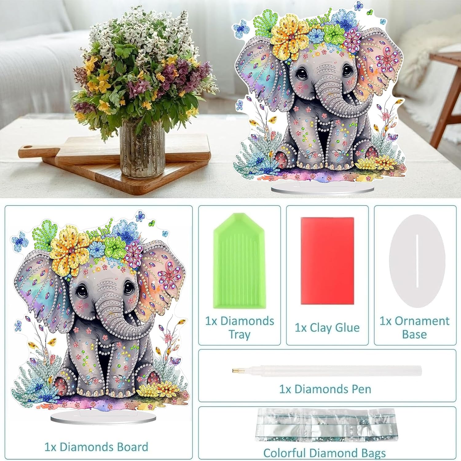 Diamond Painting Kits for Adults Beginners, 5D Full Drill Elephant Crystal Art Desktop Ornament, DIY Single Sided Home Office Desk Decor, Creative Craft Gift Set with Tools