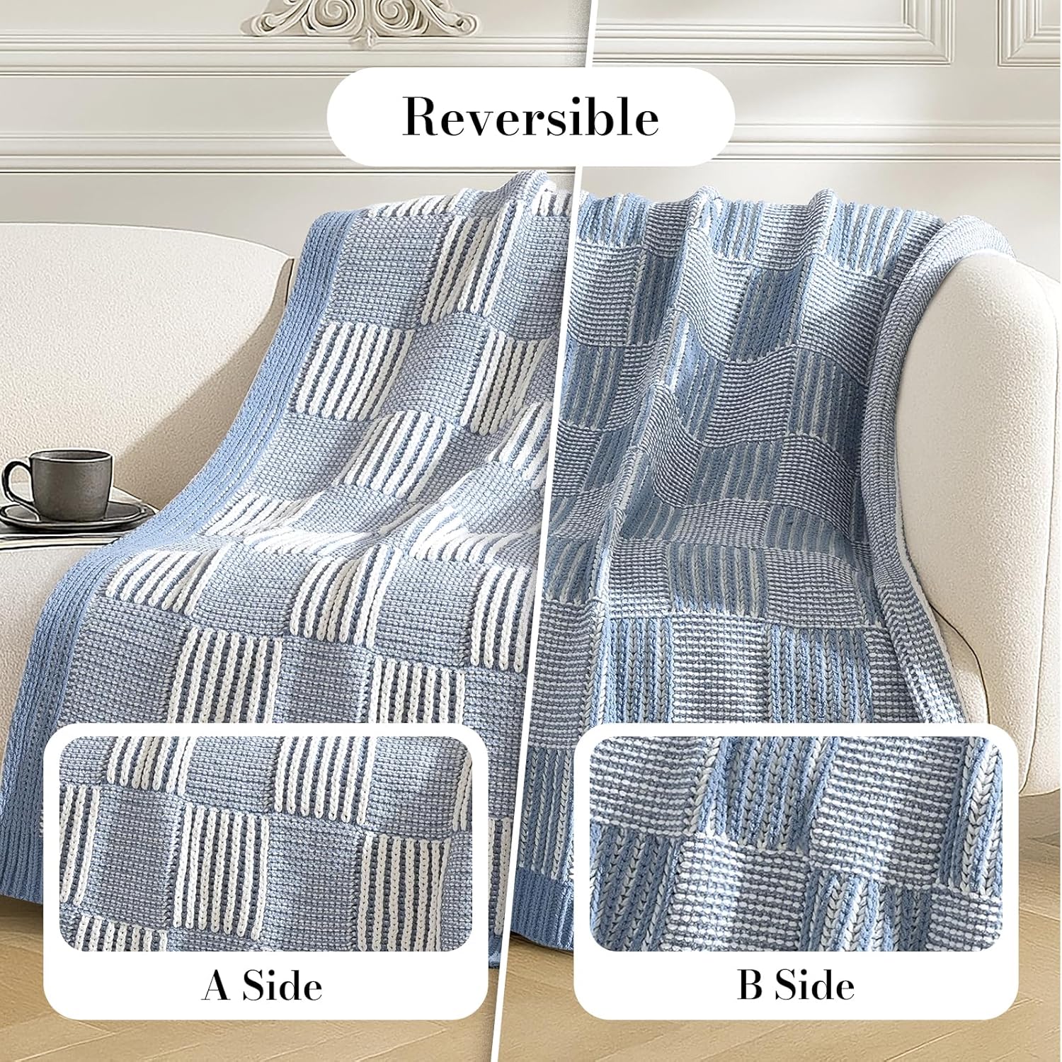 Amélie Home Chenille Knit Throw Blanket for Couch, Checkered Texture Decorative Soft Blanket for Sofa, Bed & Living Room, 50"x60", Blue & White