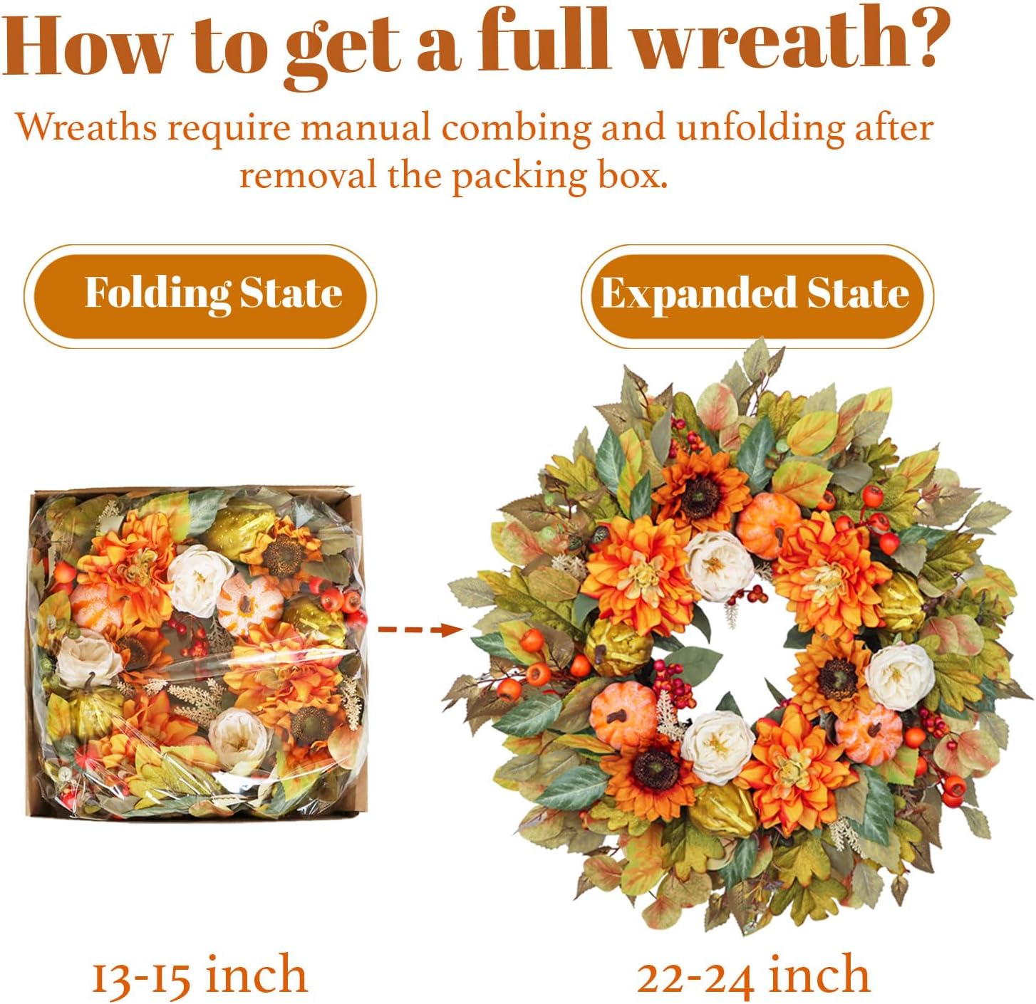 - 🍁【Lifelike Fall Wreath with Dahlias & Pumpkins】This Fall Wreath for Front Door is filled with seasonal charm, featuring a thoughtful combination of dahlias, sunflowers, Austin roses, poppy fruits, berries, pumpkins, lemon leaves, oak leaves, and eucalyptus leaves. With warm, rich colors and realistic textures, this 24 inch fall wreath brings a festive harvest vibe to any space.