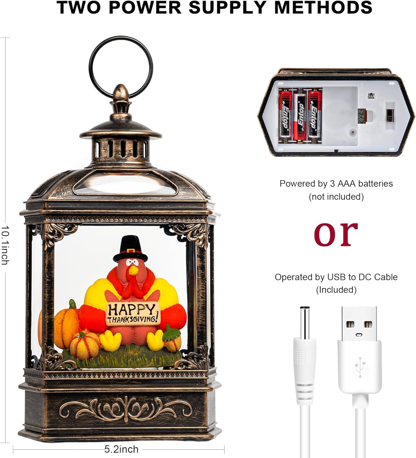 - 🍁【 Thanksgiving Feature】 - When turned on, our bronze harvest lantern features a turkey wearing a pilgrim hat and holding a sign that reads “Happy Thanksgiving,” pumpkins, and fall scenes inside. The warm LED shines on the figurines while the swirling glitter gives our harvest lantern a beautiful fall feel.
