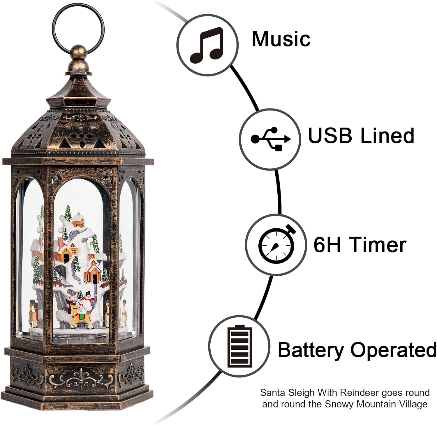 - 🎄【Animated Snow Globe】This water lantern lighted christmas village scene. Snowy mountain village with snowmen family, colorful houses, and a church with a steeple. Santa Claus rides his flying reindeer circling round and round in swirling glitter to gives our Christmas globe a whimsical look for the Christmas Holiday season.