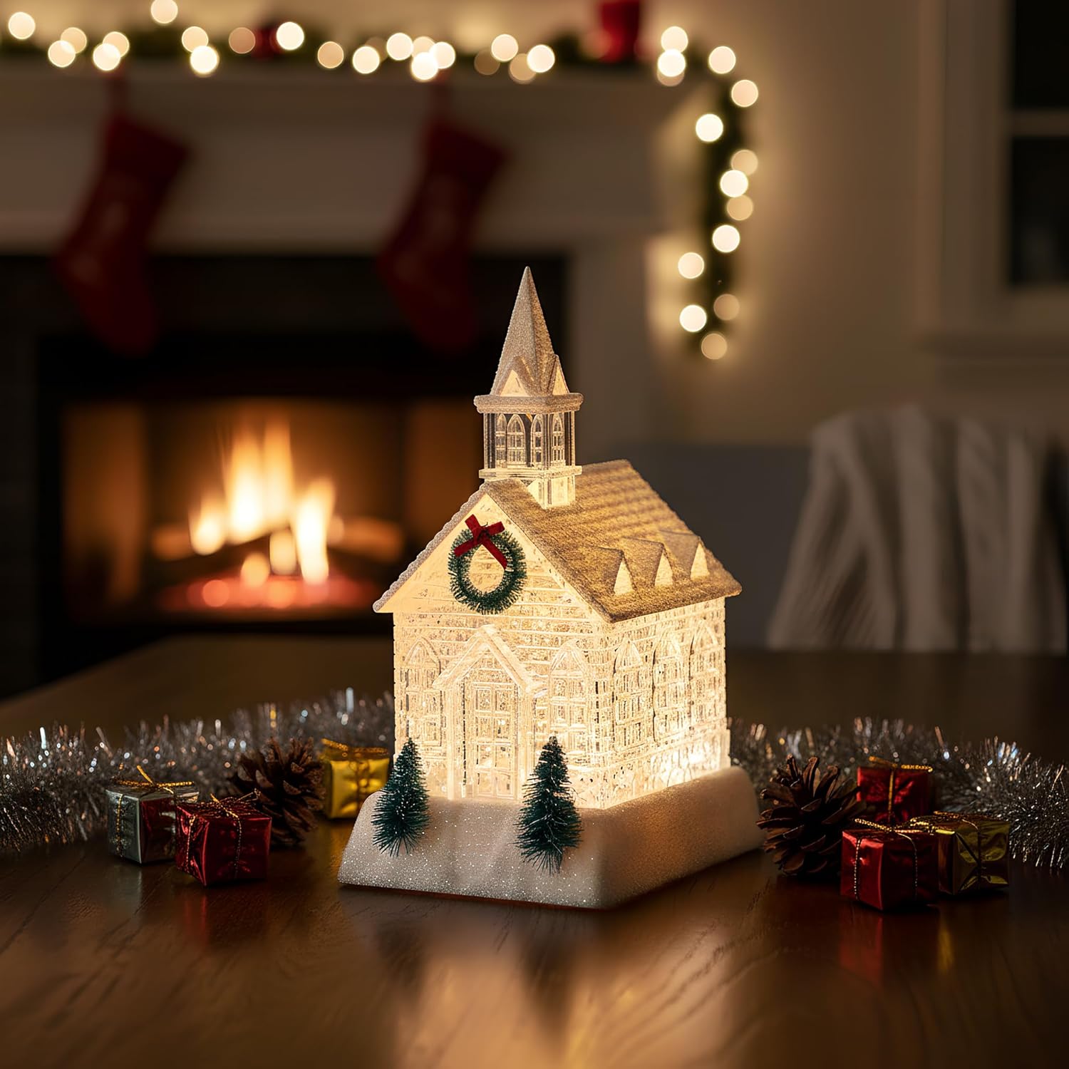 - 🎄【Lighted Musical Church】A classic white house sits atop a base with 2 evergreens, an abundance of windows and a wreath gracing the door. Within, glitter sparkles and swirls in a gentle cascade, immersing the scene in a cozy wintery glow, making it a perfect new addition for 2025.