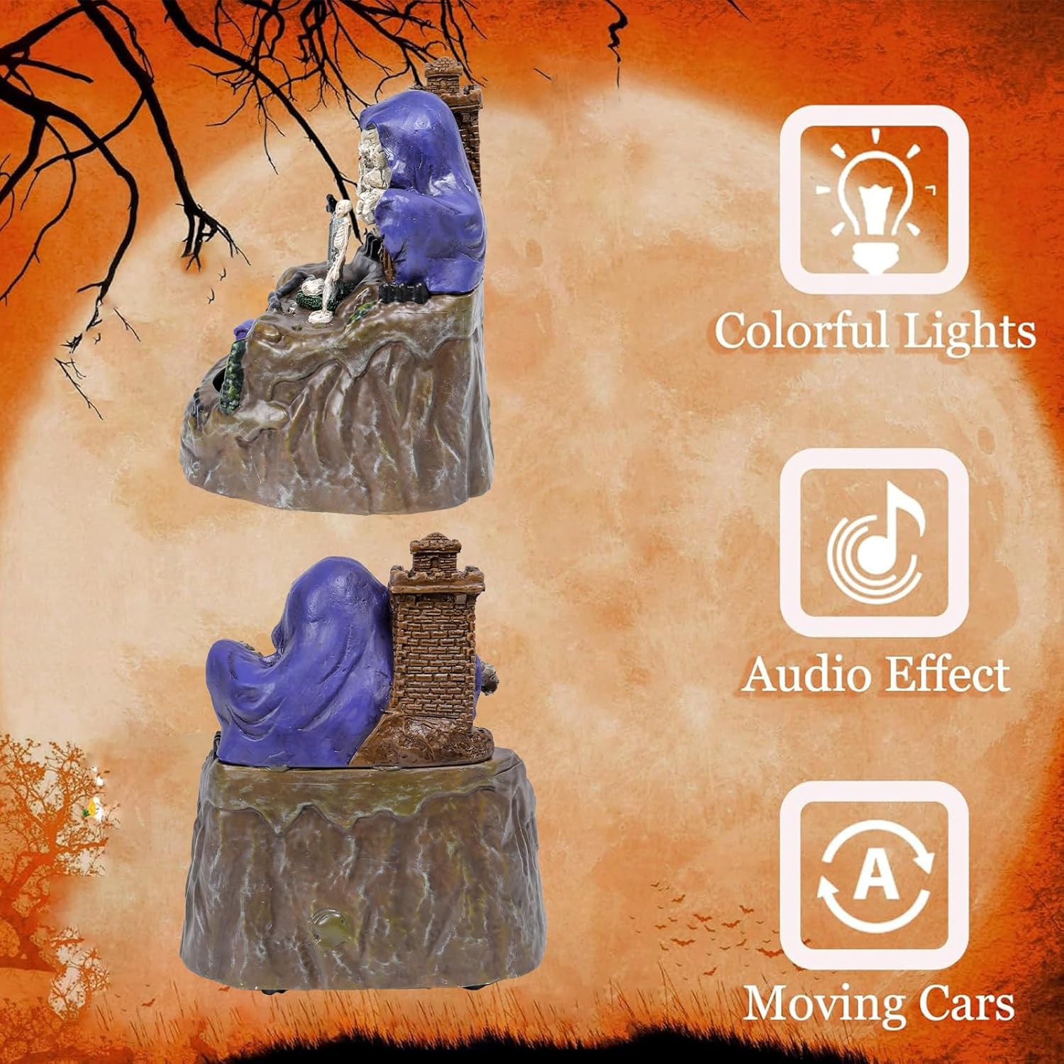 - Animated Halloween Scene – Features a spooky skeleton castle with rotating ghost train carrying skulls and pumpkins. The dynamic motion adds life and excitement to your Halloween décor.