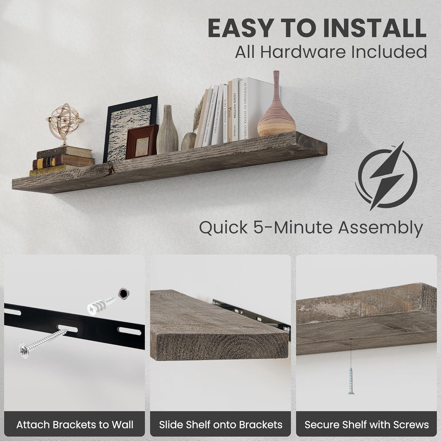 - Easy to Install - Our hanging floating shelves come with easy-to-follow installation instructions, two hand-crafted reclaimed wood shelves, two metal brackets, screws, anchors, and a level. Our dedicated customer support team is always available to assist with any questions or concerns