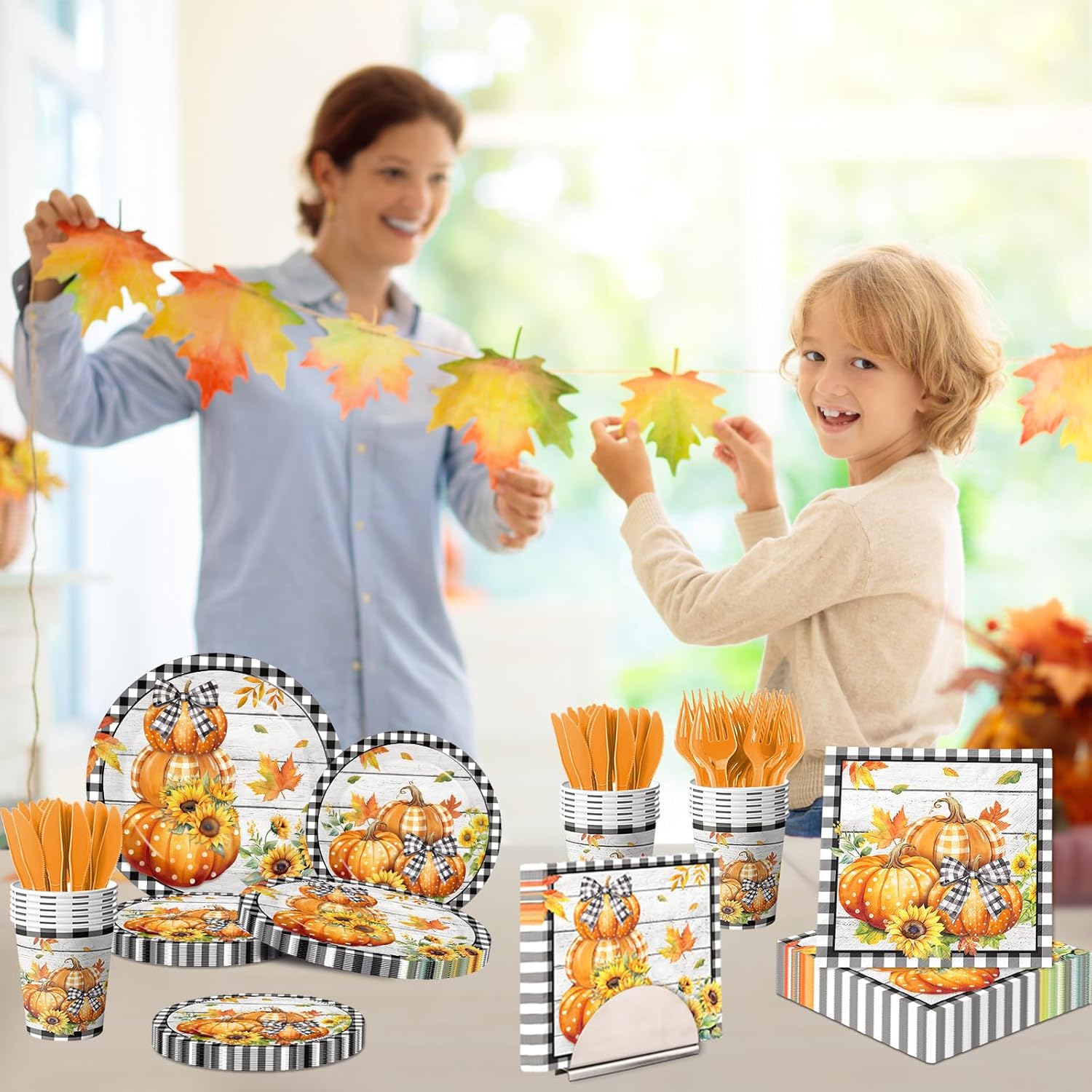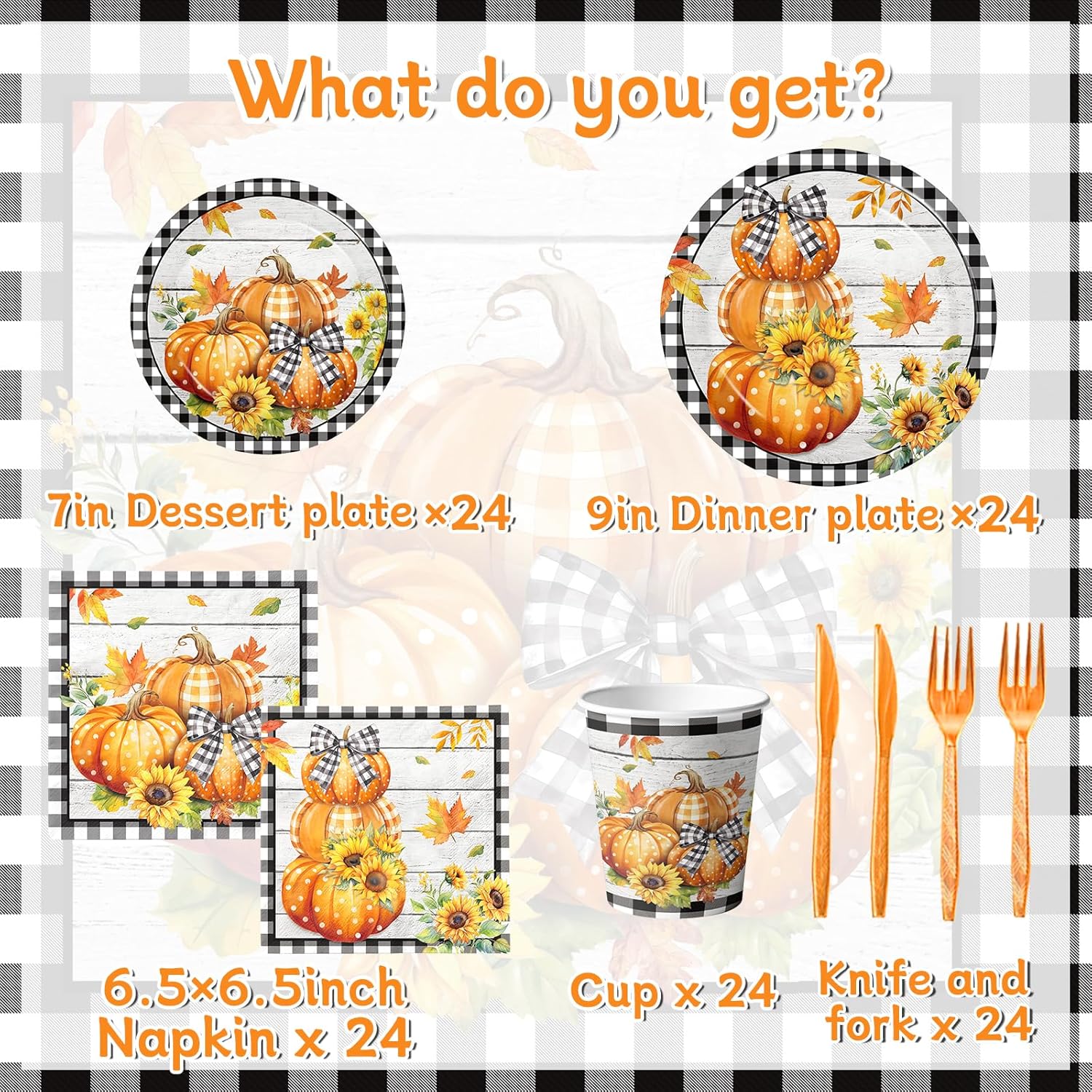 Fall Party Decorations,144Pcs Fall Thanksgiving Tableware Set Includes Plates,Napkins,Knife,Fork Black and White Buffalo Plaid Pumpkin Theme Decorations for Autumn Harvest,Thanksgiving Day