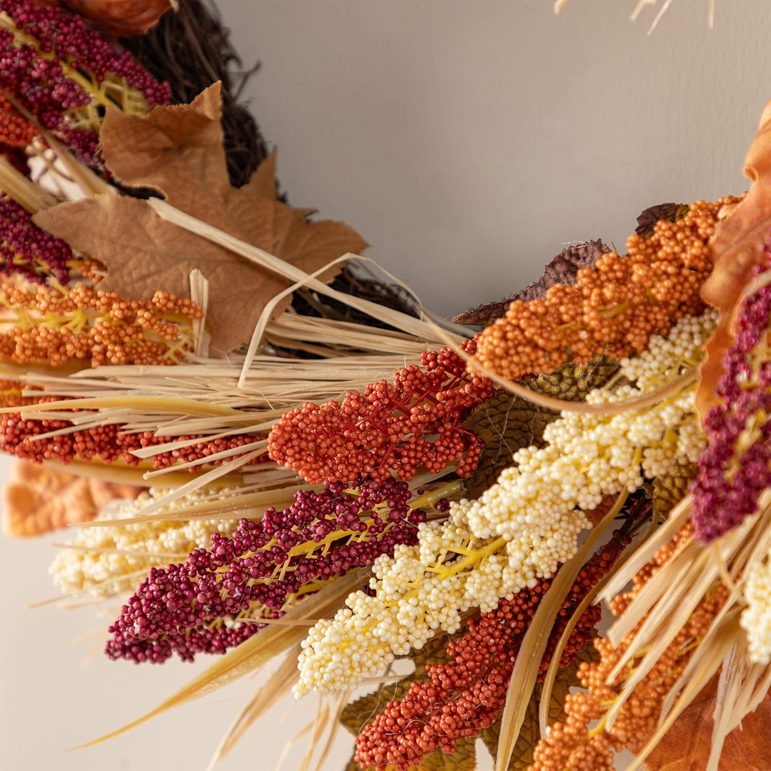 - 【Vibrant Fall Door Wreath】Adorn your entryway with this 24" multi-colored sorghum wreath, featuring rich autumn hues—perfect for fall wreaths for front door seasonal styling.