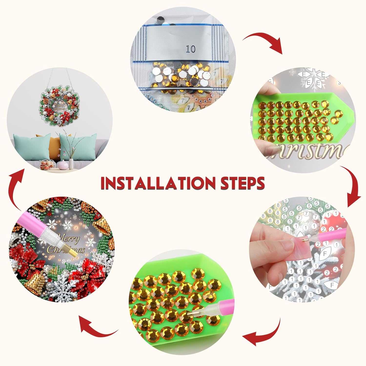 NEWENMO Diamond Art Hanging Kit for Adult, Merry Christmas Wreath, DIY Special Shaped Crystal Acrylic Diamond Art Painting Window Pendants, Diamond Painting Ornament for Home Garden Wall Decor